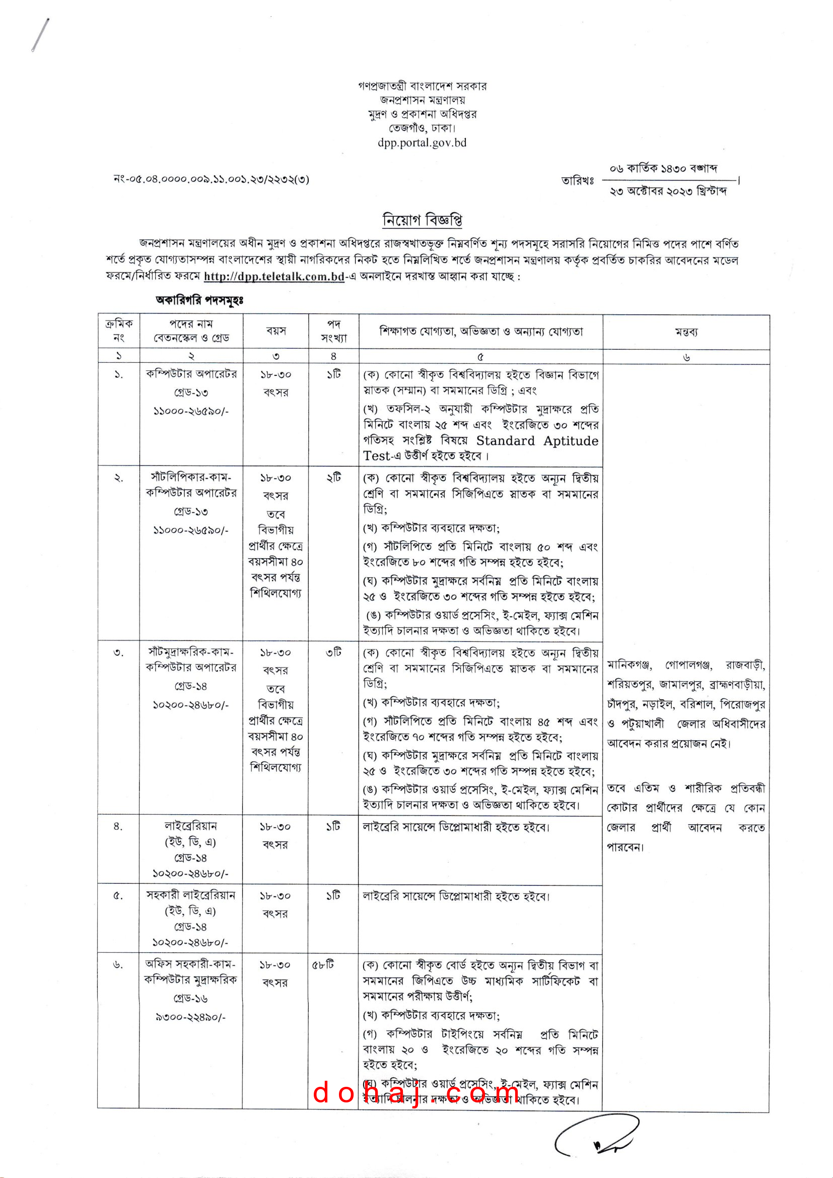DPP Job Circular: জনপ্রশাসন মন্ত্রণালয়ের অথীন মুদ্রণ ও প্রকাশনা অধিদপ্তরে নিম্নবর্ণিত শূন্য পদগুলোয় জনবল নিয়োগ দেয়া হবে। মুদ্রণ ও প্রকাশনা অধিদপ্তর ২২ টি পদে মোট ৫১২ জনকে নিয়োগ দেবে। আগ্রহী প্রার্থীরা অনলাইনে আবেদন করতে পারবেন। পদগুলোতে নারী ও পুরুষ উভয়েই আবেদন করতে পারবেন। আগ্রহ ও যোগ্যতা থাকলে আপনিও আবেদন করতে পারেন। সম্পূর্ণ বিজ্ঞপ্তি বিস্তারিত দেওয়া হল।