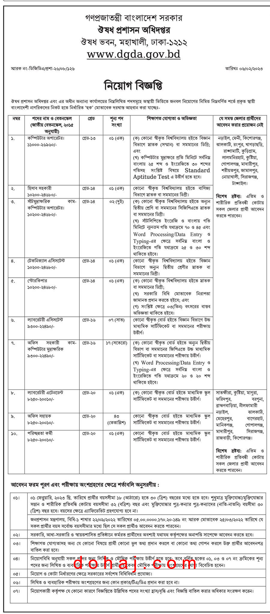 DGDA Govt Job circular: ঔষধ প্রশাসন অধিদপ্তর শূন্য পদসমূহে জনবল নিয়োগের জন্য নিয়োগ বিজ্ঞপ্তি প্রকাশ করেছে। ঔষধ প্রশাসন অধিদপ্তর ১০ পদে মোট ৭৫ জনকে নিয়োগ দেবে। পদগুলোতে নারী ও পুরুষ উভয়ই প্রার্থীরা আবেদন করতে পারবেন। আগ্রহী প্রার্থীরা অনলাইনে আবেদন করতে পারবেন। আগ্রহ ও যোগ্যতা থাকলে আপনিও আবেদন করতে পারেন। আবেদন প্রক্রিয়াসহ সম্পূর্ণ বিজ্ঞপ্তি বিস্তারিত দেওয়া হল: