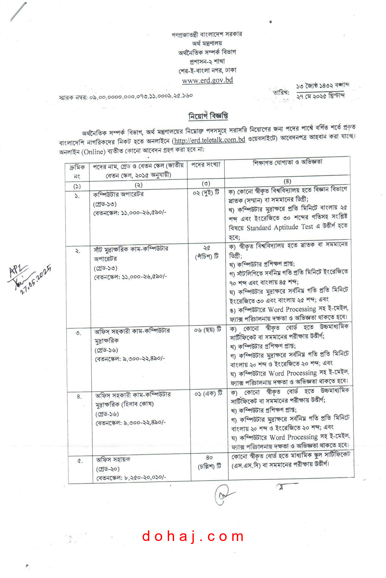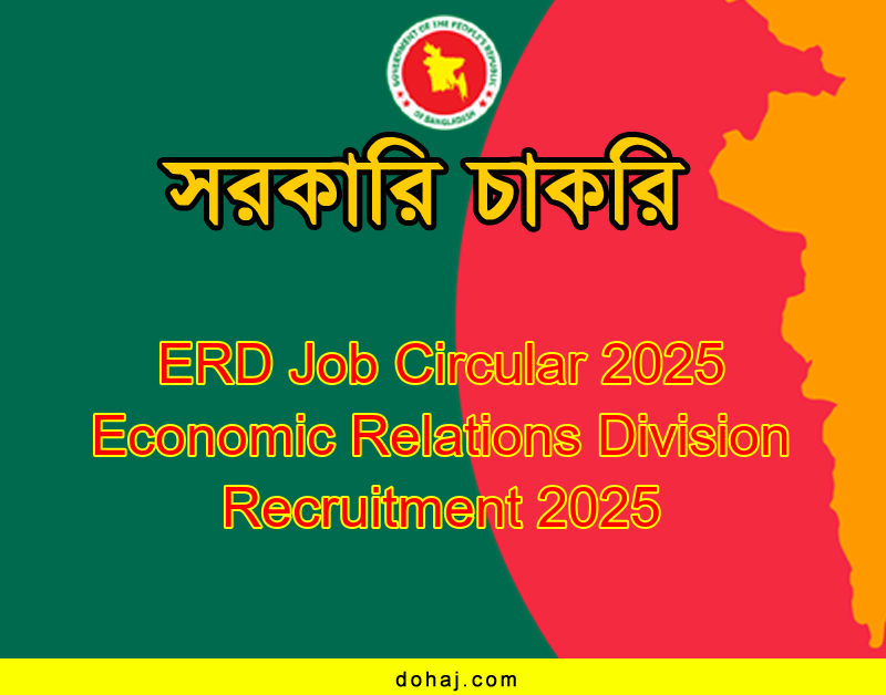 ERD Job Circular 2025: অর্থনৈতিক সম্পর্ক বিভাগ, অর্থ মন্ত্রণালয় এর শূন্য পদসমূহে জনবল নিয়োগ দেয়া হবে। অর্থনৈতিক সম্পর্ক বিভাগ ০৫ টি পদে মোট ৭৪ জনকে নিয়োগ দেবে। পদগুলোতে নারী ও পুরুষ উভয়েই আবেদন করতে পারবেন। আগ্রহী প্রার্থীরা অনলাইনে আবেদন করতে পারবেন। আগ্রহ ও যোগ্যতা থাকলে আপনিও আবেদন করতে পারেন। সম্পূর্ণ বিজ্ঞপ্তি বিস্তারিত দেওয়া হল।