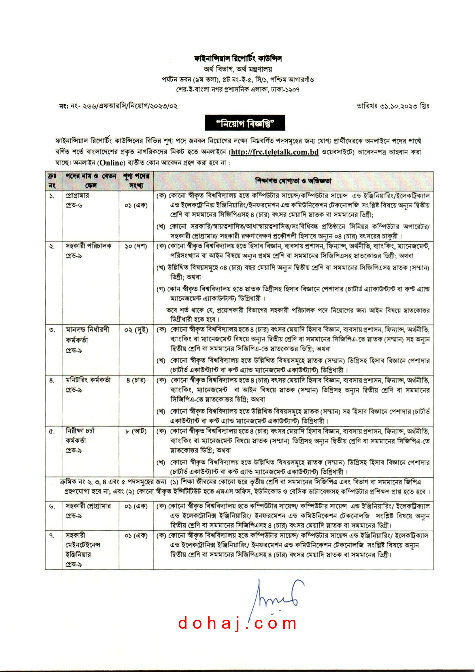 FRC Job circular: অর্থ মন্ত্রনালয়ের আওতাধীন ফাইনান্সিয়াল রিপোর্টিং কাউন্সিলের বিভিন্ন শূন্য পদসমূহে জনবল নিয়োগের বিজ্ঞপ্তি প্রকাশিত হয়েছে। ফাইনান্সিয়াল রিপোর্টিং কাউন্সিল ১৫ টি পদে মোট ৫৭ জনকে নিয়োগ দেবে। আগ্রহী প্রার্থীরা অনলাইনে আবেদন করতে পারবেন। পদগুলোতে নারী ও পুরুষ উভয়েই আবেদন করতে পারবেন। আগ্রহ ও যোগ্যতা থাকলে আপনিও আবেদন করতে পারেন। সম্পূর্ণ বিজ্ঞপ্তি বিস্তারিত দেওয়া হল।