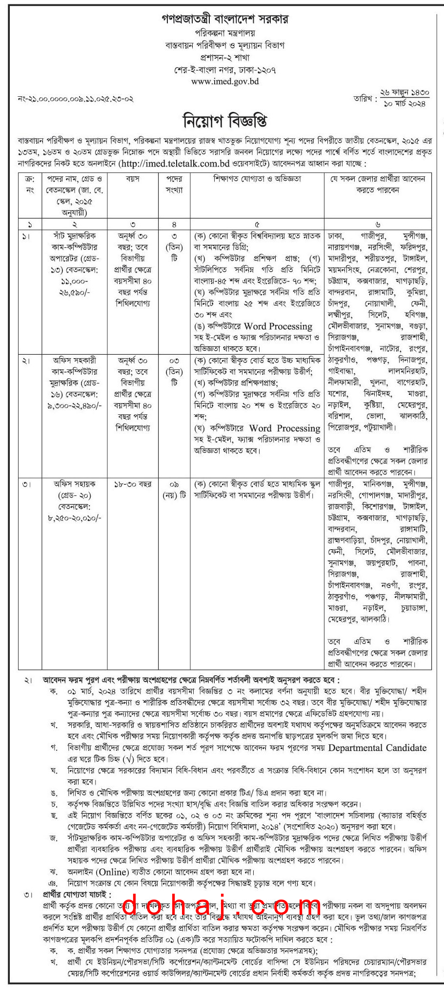 IMED Job Circular 2024: বাস্তবায়ন পরিবীক্ষণ ও মূল্যায়ন বিভাগের শূন্য পদসমূহে জনবল নিয়োগ দেয়া হবে। বাস্তবায়ন পরিবীক্ষণ ও মূল্যায়ন বিভাগ ০৩টি পদে মোট ১৫ জনকে নিয়োগ দেবে। আগ্রহী প্রার্থীরা অনলাইনে আবেদন করতে পারবেন। পদগুলোতে নারী ও পুরুষ উভয়েই আবেদন করতে পারবেন। আগ্রহ ও যোগ্যতা থাকলে আপনিও আবেদন করতে পারেন। সম্পূর্ণ বিজ্ঞপ্তি বিস্তারিত দেওয়া হল।