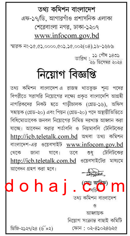 ICB Job Circular 2025: তথ্য কমিশনের শূন্য পদে জনবল নিয়োগের জন্য পুনঃনিয়োগ বিজ্ঞপ্তি প্রকাশ করেছে। তথ্য কমিশন ৩টি পদে মোট ১৪ জনকে নিয়োগ দেবে। পদগুলোতে নারী ও পুরুষ উভয়েই আবেদন করতে পারবেন। আগ্রহী প্রার্থীরা অনলাইনে আবেদন করতে পারবেন। আগ্রহ ও যোগ্যতা থাকলে আপনিও আবেদন করতে পারেন। সম্পূর্ণ বিজ্ঞপ্তি বিস্তারিত দেওয়া হল।