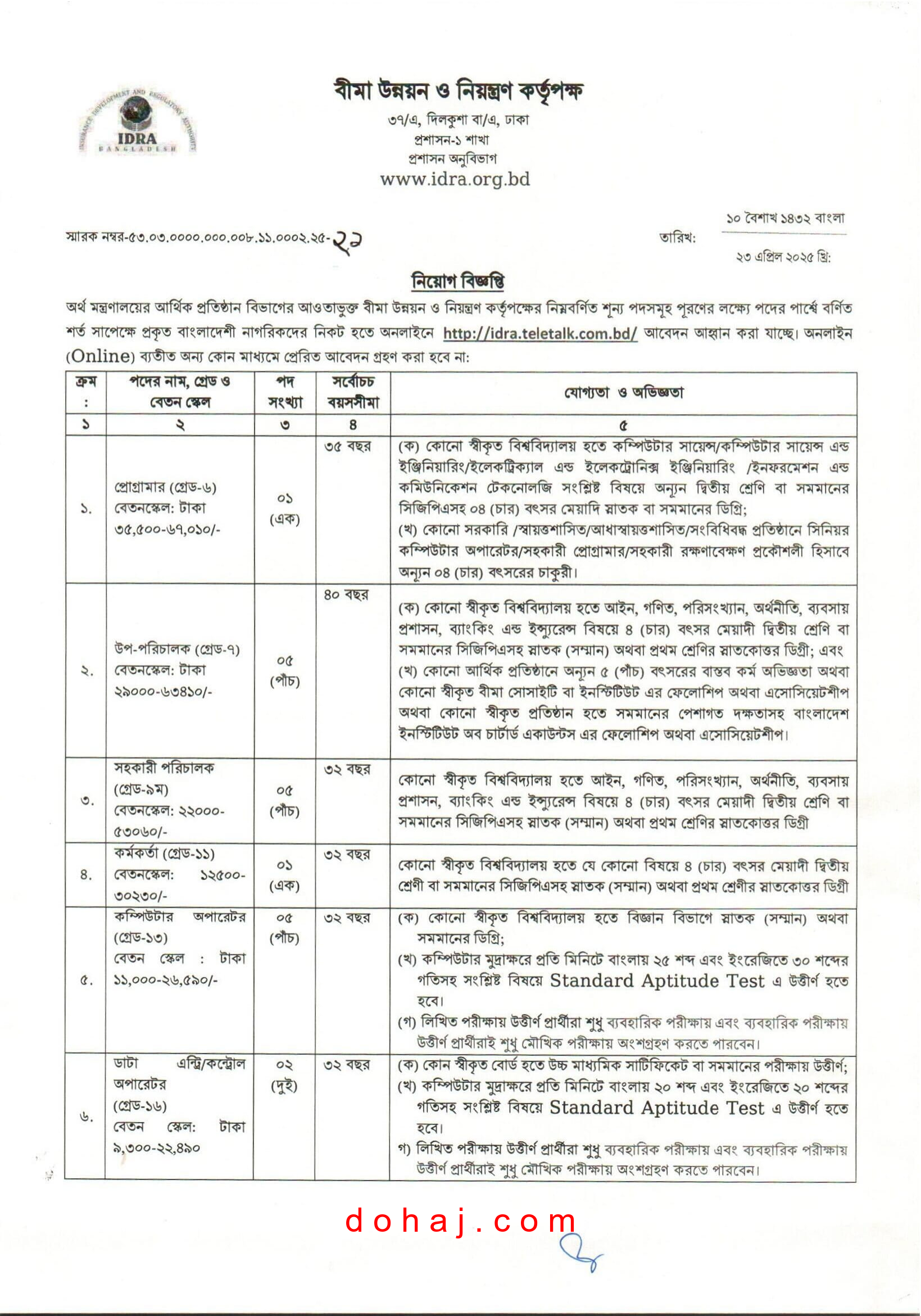 Insurance Development and Regulatory Authority Job Circular: অর্থ মন্ত্রণালয়ের আর্থিক প্রতিষ্ঠান বিভাগের আওতাধীন ‘বীমা উন্নয়ন ও নিয়ন্ত্রণ কর্তৃপক্ষ’ এর শূন্য পদসমূহে জনবল নিয়োগ দেয়া হবে। বীমা উন্নয়ন ও নিয়ন্ত্রণ কর্তৃপক্ষ ০৬ টি পদে মোট ১৯ জনকে নিয়োগ দেয়া হবে। পদগুলোতে সকল জেলার নারী ও পুরুষ উভয়েই আবেদন করতে পারবেন। আগ্রহী প্রার্থীরা অনলাইনে আবেদন করতে পারবেন। সম্পূর্ণ বিজ্ঞপ্তি (IDRA job circular 2025) বিস্তারিত দেওয়া হল।
