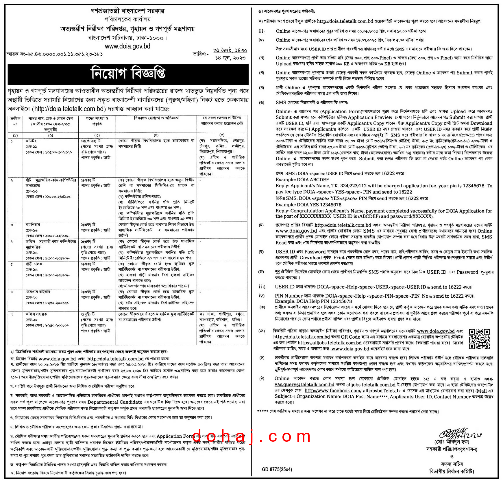 আবেদন প্রক্রিয়া: আগ্রহী প্রার্থীরা অনলাইনে http://doia.teletalk.com.bd এই ওয়েবসাইটে গিয়ে আবেদনপত্র পূরণ করতে পারবেন।