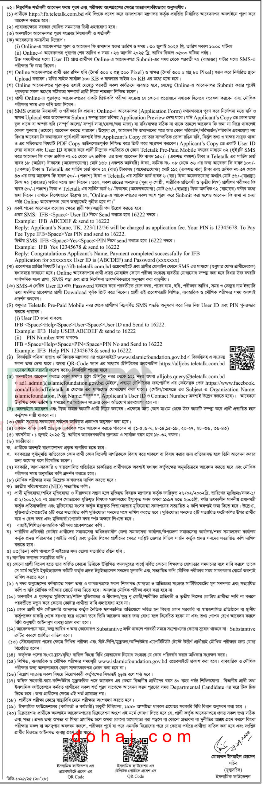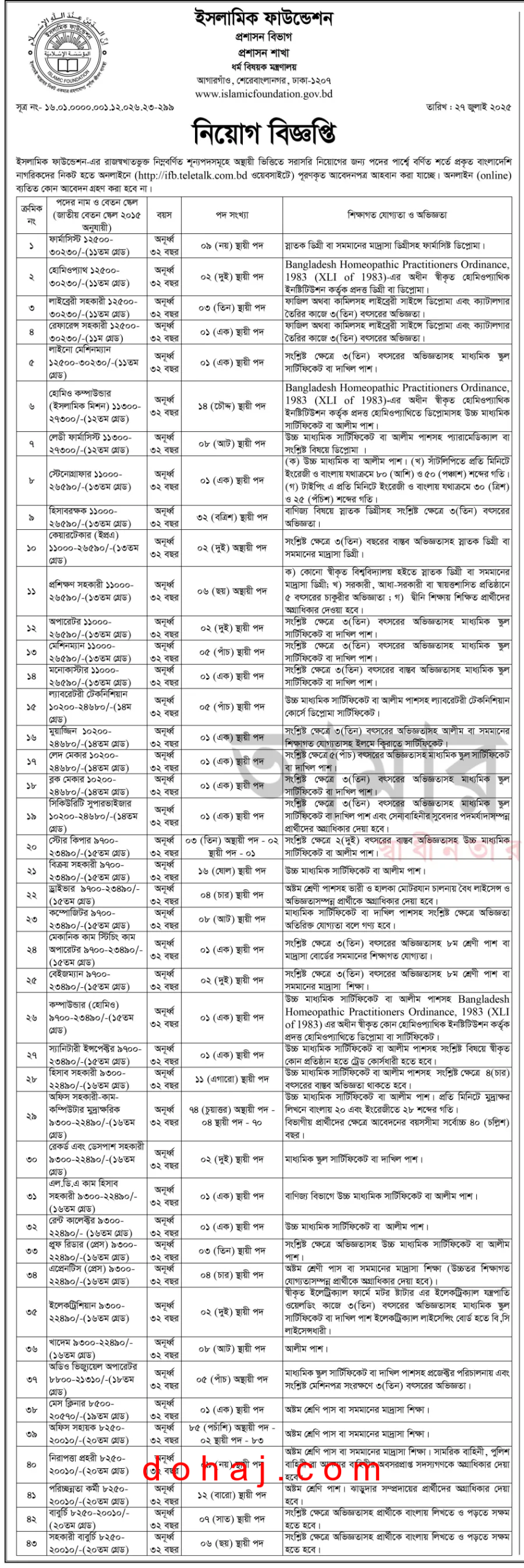 শিক্ষাগত যোগত্যা: স্নাতক ডিগ্রী বা সমমানের ডিগ্রী বা দাওরায়ে হাদিস পাশ