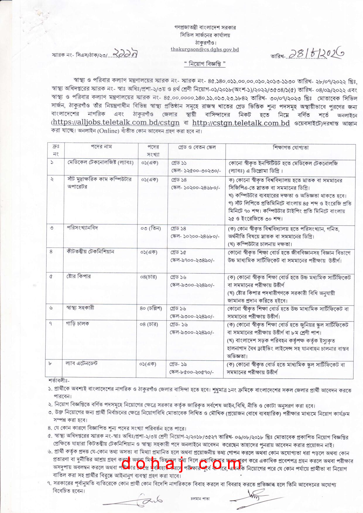 Thakurgaon Civil Surgeon Office Job Circular: সিভিল সার্জন এর কার্যালয়, ঠাকুরগাঁও এর শূন্য পদসমূহে জনবল নিয়োগের বিজ্ঞপ্তি প্রকাশ হয়েছে। ঠাকুরগাঁও সিভিল সার্জন এর কার্যালয়ে ০৮ টি পদে মোট ৫৫ জনকে নিয়োগ দেয়া হবে। আগ্রহী প্রার্থীরা অনলাইনে আবেদন করতে পারবেন। সম্পূর্ণ বিজ্ঞপ্তি বিস্তারিত দেওয়া হল।