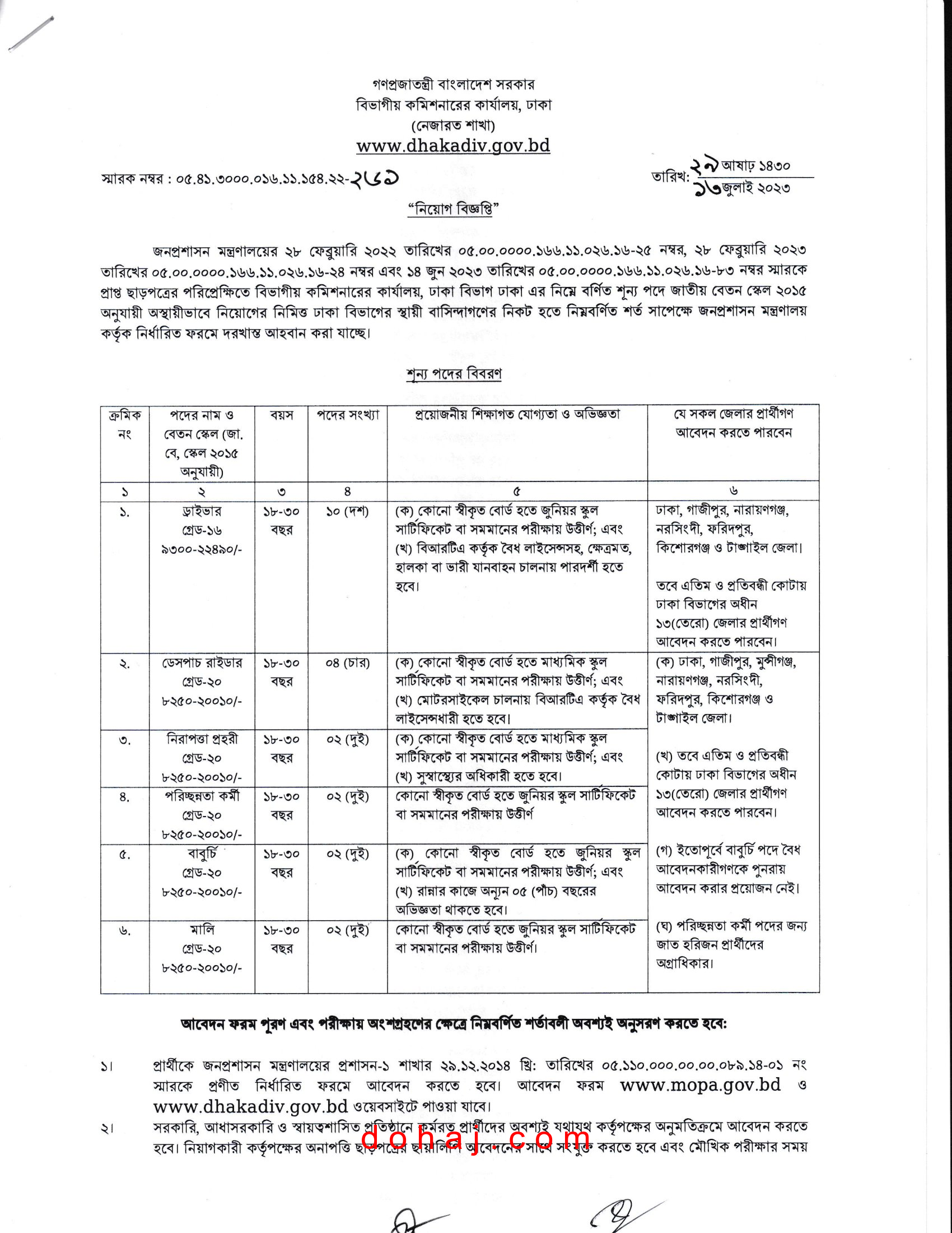 Divisional Commissioner Office Dhaka Job Circular: বিভাগীয় কমিশনারের কার্যালয়, ঢাকা বিভাগ, ঢাকা এর শূন্য পদসমূহে সরাসরি ভাবে জনবল নিয়োগের বিজ্ঞপ্তি প্রকাশ করেছে। ঢাকা বিভাগীয় কমিশনারের কার্যালয় ০৬ টি পদে মোট ২২ জনকে নিয়োগ দেবে। উক্ত পদে নারী-পুরুষ উভয় প্রার্থীরা আবেদন করতে পারবেন। আবেদন প্রক্রিয়াসহ সম্পূর্ণ বিজ্ঞপ্তি বিস্তারিত দেওয়া হল।