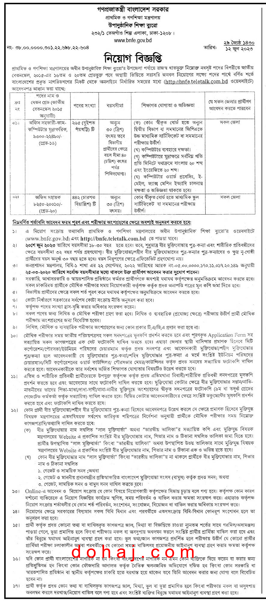 BNFE Job Circular 2023: প্রাথমিক ও গণশিক্ষা মন্ত্রণালয়ের অধীন উপানুষ্ঠানিক শিক্ষা ব্যুরোর শূন্য পদসমূহে বিশাল জনবল নিয়োগের বিজ্ঞপ্তি প্রকাশ হয়েছে। উপানুষ্ঠানিক শিক্ষা ব্যুরো ০২টি পদে মোট ৭০৭ জনকে নিয়োগ দেবে। এই চাকরিতে সকল জেলার প্রার্থীরা আবেদন করতে পারবেন। আগ্রহী প্রার্থীরা অনলাইনে আবেদন করতে পারবেন। পদগুলোতে নারী ও পুরুষ উভয়েই আবেদন করতে পারবেন। আগ্রহ ও যোগ্যতা থাকলে আপনিও আবেদন করতে পারেন। সম্পূর্ণ বিজ্ঞপ্তি (bnfe job circular 2023) বিস্তারিত দেওয়া হল।