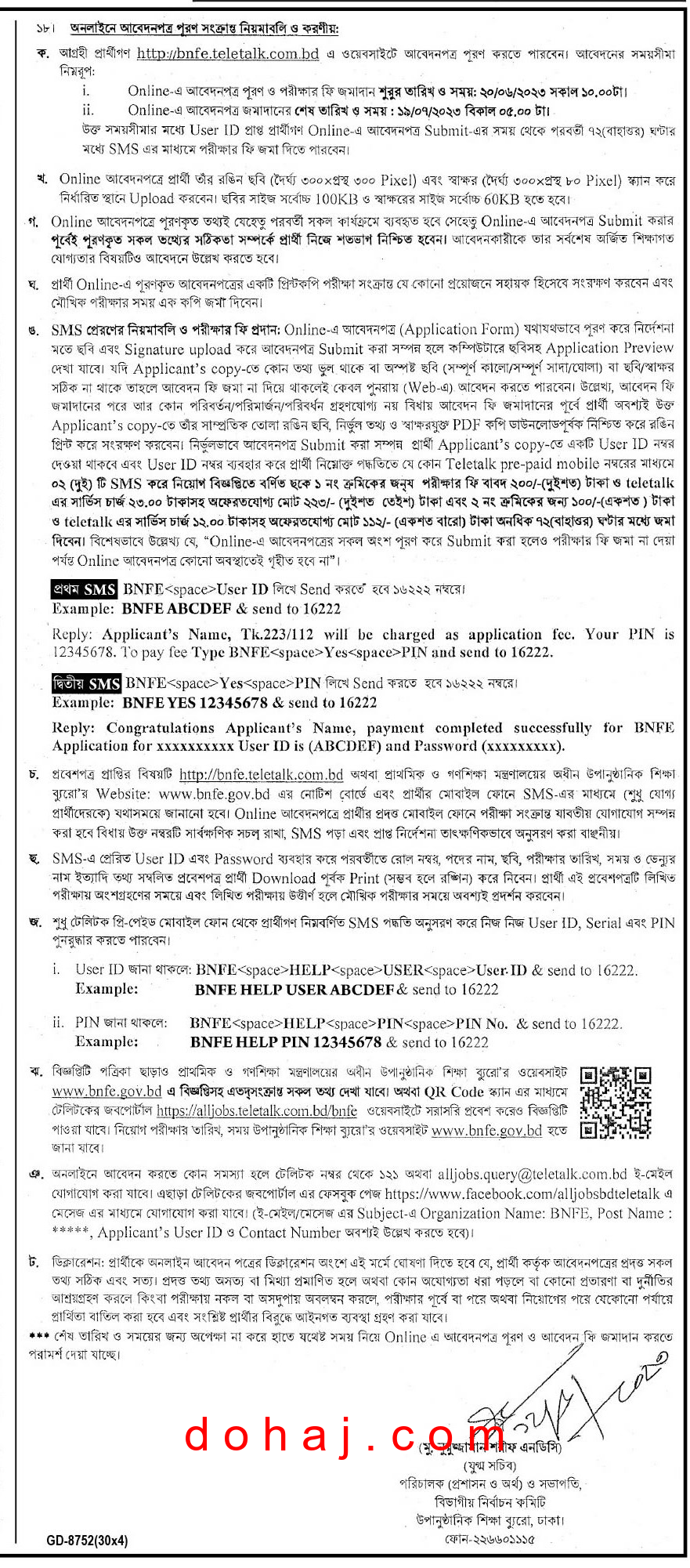 আবেদন প্রক্রিয়া: আগ্রহী প্রার্থীরা অনলাইনে http://bnfe.teletalk.com.bd এই ওয়েবসাইটে গিয়ে আবেদনপত্র পূরণ করতে পারবেন।