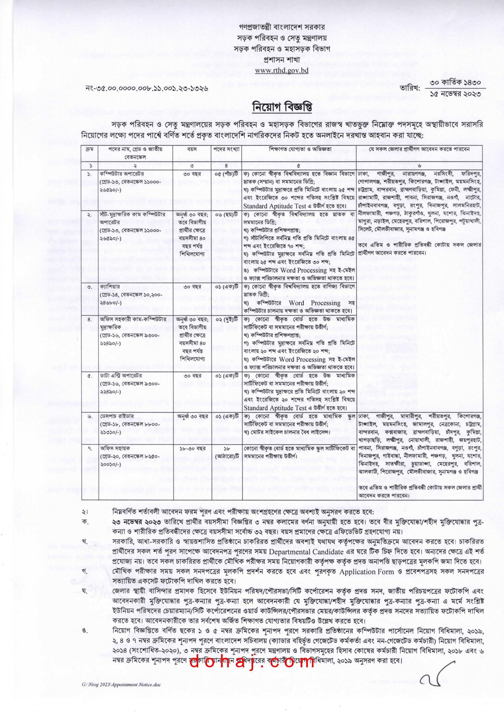 সড়ক পরিবহন ও সেতু মন্ত্রণালয়ের সড়ক পরিবহন ও মহাসড়ক বিভাগের শূন্য পদসমূগে জনবল নিয়োগ দেয়া হবে। সড়ক পরিবহন ও মহাসড়ক বিভাগ ০৭ টি পদে মোট ৩৪ জনকে নিয়োগ দেবে। পদগুলোতে নারী ও পুরুষ উভয়েই আবেদন করতে পারবেন। আগ্রহী প্রার্থীরা অনলাইনে আবেদন করতে পারবেন। সম্পূর্ণ বিজ্ঞপ্তি বিস্তারিত দেওয়া হল। সরকারি বেসরকারি সকল চাকরির খবর সবার আগে পড়তে আমাদের চাকরির খবর পেজে বিজিট করুন।
