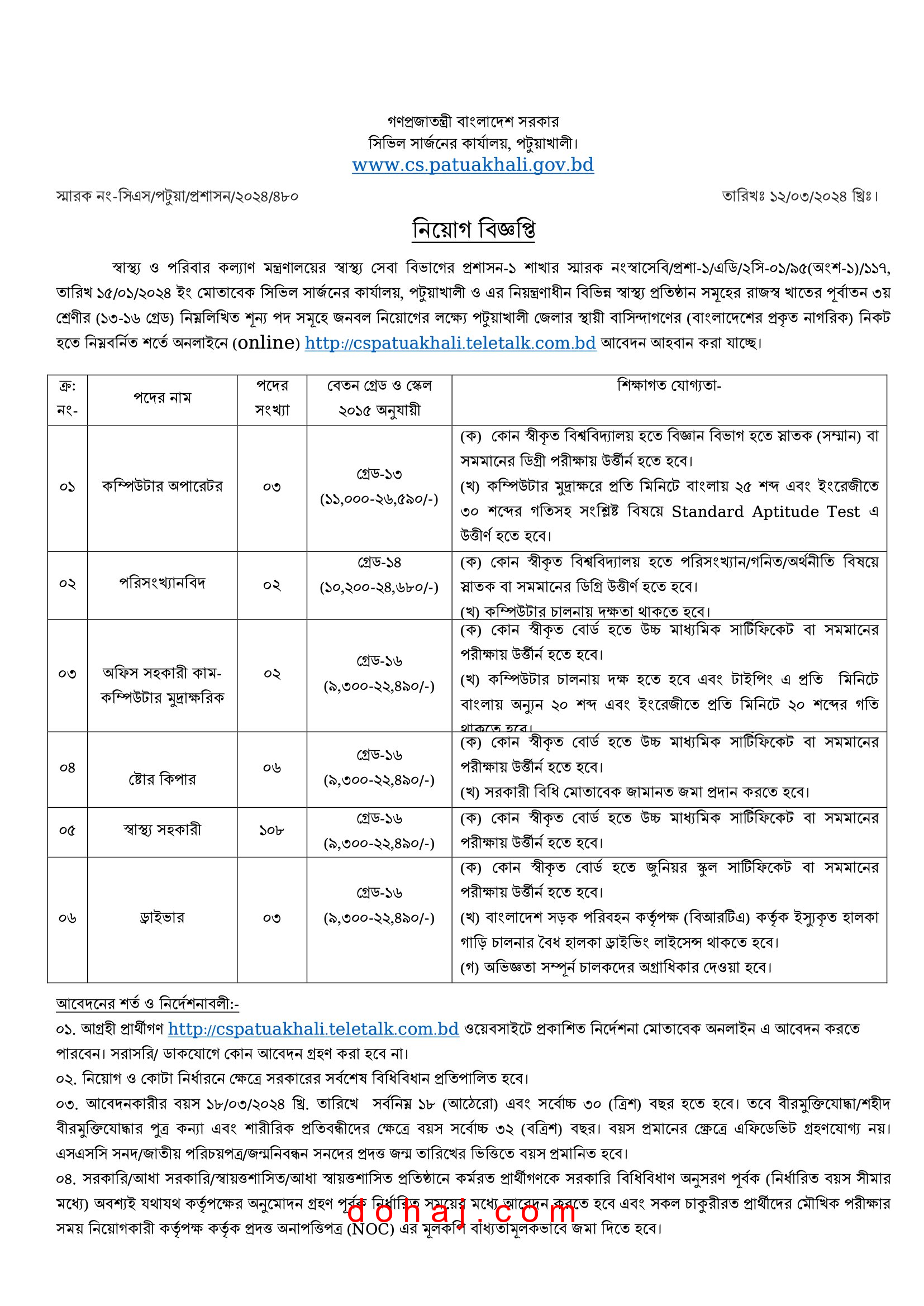 Patuakhali Civil Surgeon Office Job Circular: সিভিল সার্জন এর কার্যালয়, পটুয়াখালী এর শূন্য পদসমূহে জনবল নিয়োগের বিজ্ঞপ্তি প্রকাশ হয়েছে। পটুয়াখালী সিভিল সার্জন এর কার্যালয়ে ০৬ টি পদে মোট ১২৪ জনকে নিয়োগ দেয়া হবে। আগ্রহী প্রার্থীরা অনলাইনে আবেদন করতে পারবেন। সম্পূর্ণ বিজ্ঞপ্তি বিস্তারিত দেওয়া হল।