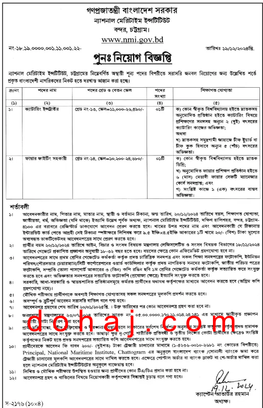ন্যাশনাল মেরিটাইম ইন্সটিটিউট, চট্টগ্রামে শূন্য পদে লোক নিয়োগের জন্য নিয়োগ বিজ্ঞপ্তি প্রকাশ করেছে। ন্যাশনাল মেরিটাইম ইন্সটিটিউট ০২ টি পদে ০২ জনকে নিয়োগ দেবে। উক্ত পদসমূহে নারী-পুরুষ উভয়ই আবেদন করতে পারবেন। আগ্রহ ও যোগ্যতা থাকলে আপনিও আবেদন করতে পারেন। আবেদন প্রক্রিয়াসহ সম্পূর্ণ বিজ্ঞপ্তি বিস্তারিত দেওয়া হল: