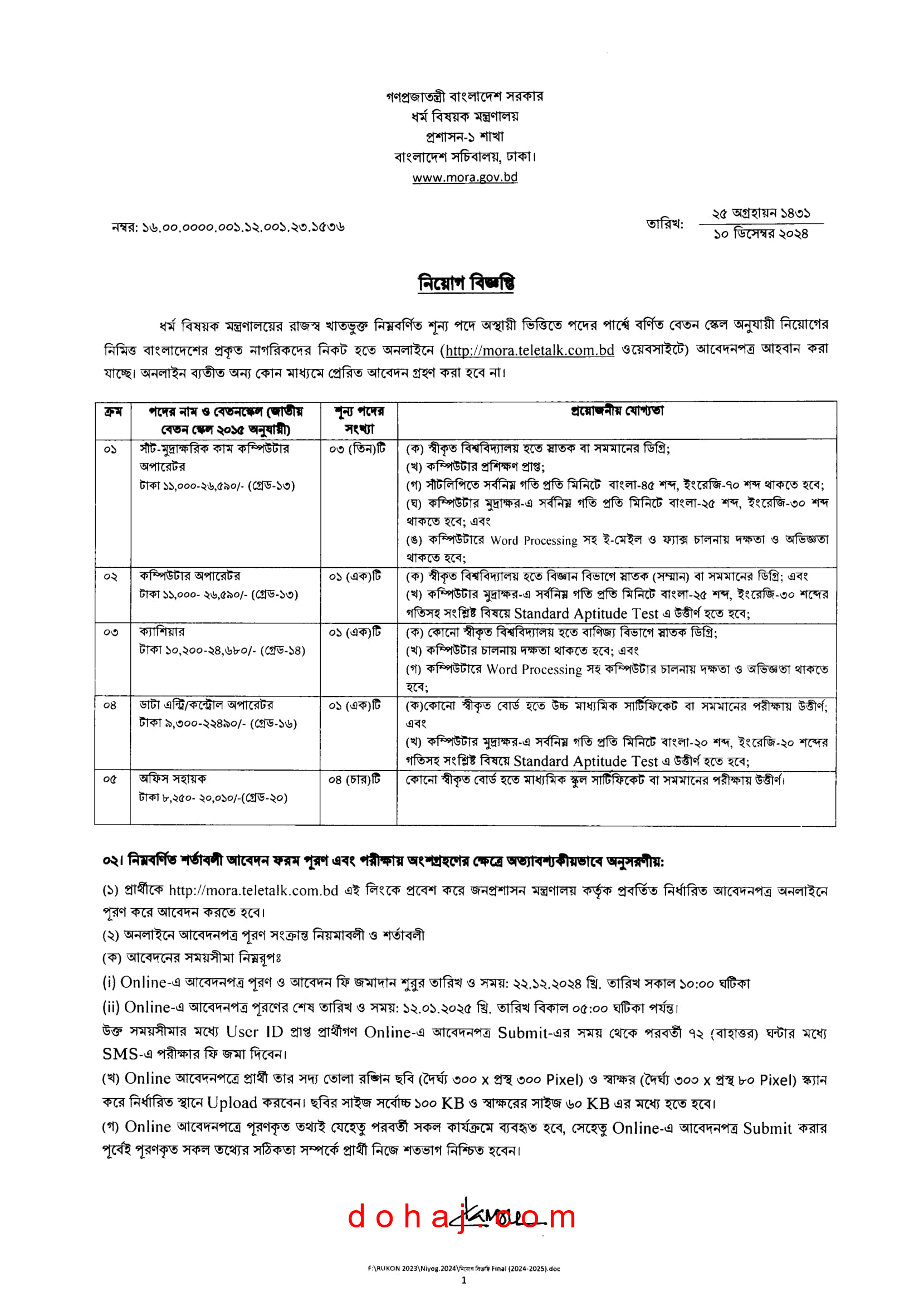 MORA Job circular 2025: ধর্ম বিষয়ক মন্ত্রণালয়ের শূন্য পদসমূহে জনবল নিয়োগের বিজ্ঞপ্তি প্রকাশ করা হয়েছে। ধর্ম বিষয়ক মন্ত্রণালয় ১ম বিজ্ঞপ্তি অনুসারে ৫ টি পদে মোট ০৯ জনকে নিয়োগ দেবে ও ২য় বিজ্ঞপ্তি অনুসারে ৫ টি পদে মোট ১০ জনকে নিয়োগ দেবে। উক্ত পদে নারী-পুরুষ উভয়ই আবেদন করতে পারবেন। আগ্রহী প্রার্থীরা অনলাইনে আবেদন করতে পারবেন। আগ্রহ ও যোগ্যতা থাকলে আপনিও আবেদন করতে পারেন। আবেদন প্রক্রিয়াসহ সম্পূর্ণ বিজ্ঞপ্তি বিস্তারিত দেওয়া হল।