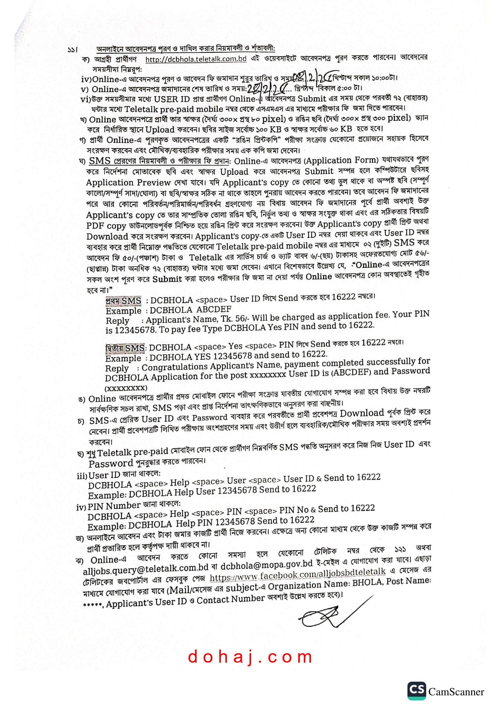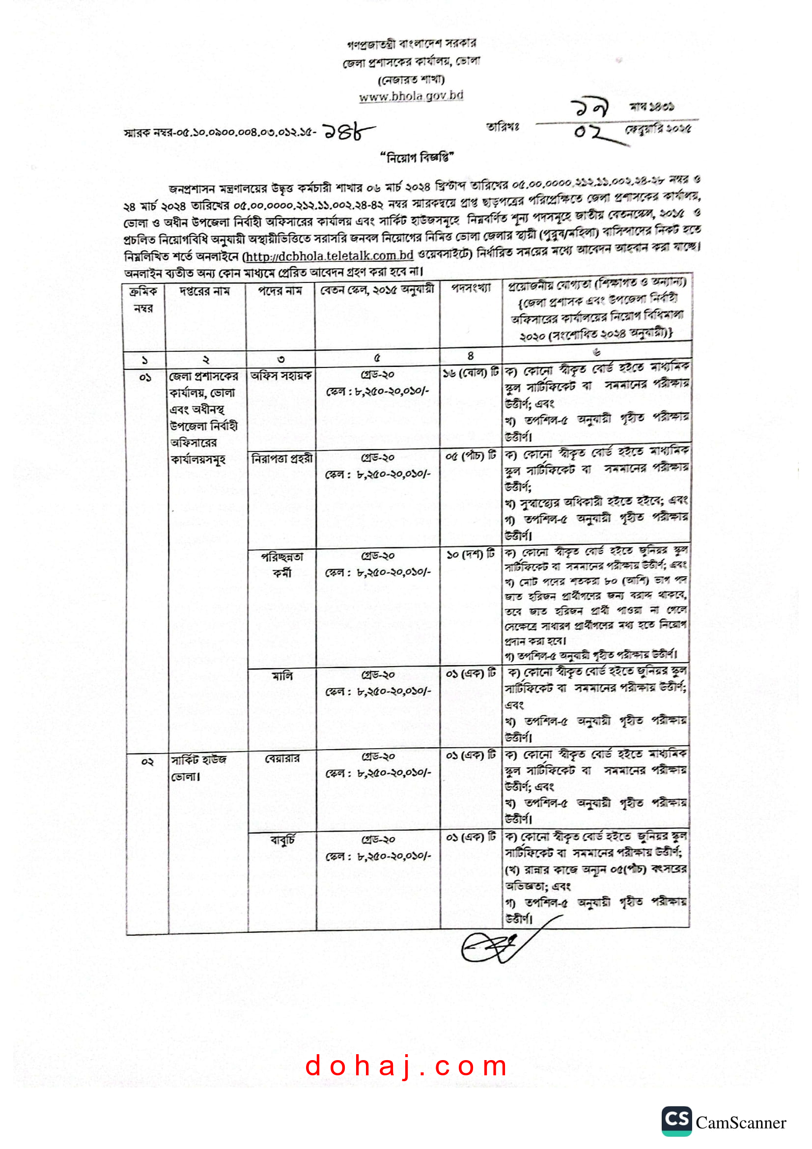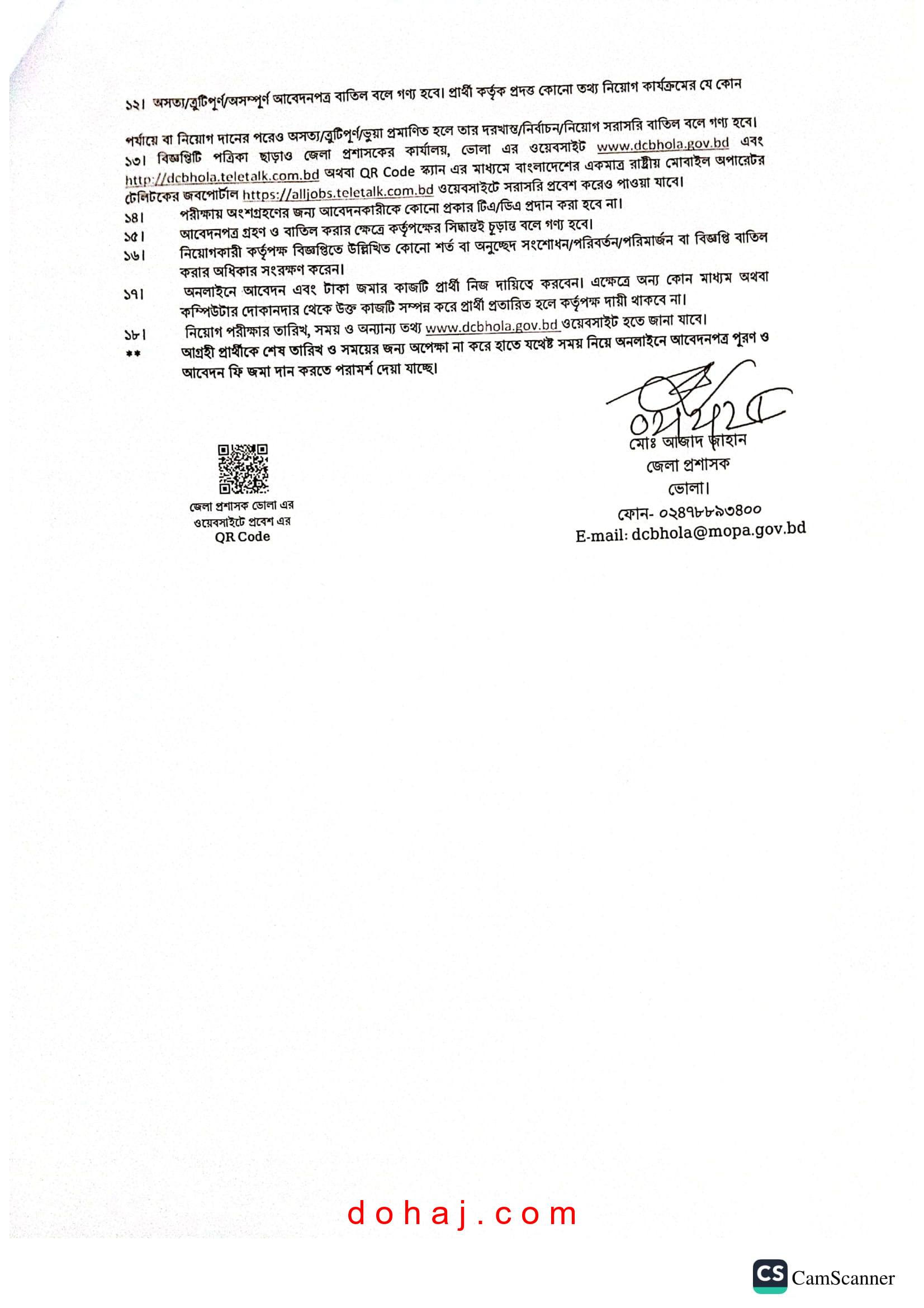আবেদন প্রক্রিয়া: আবেদন করতে হবে অনলাইনে http://dcbhola.teletalk.com.bd/ ওয়েবসাইটের মাধমে অনলাইনে আবেদনপত্র পাঠাতে হবে।