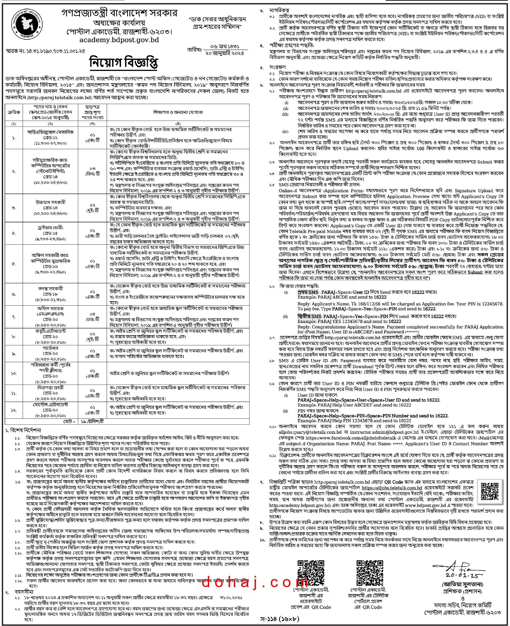 ডাক অধিদপ্তরের অধীনস্থ অধ্যক্ষের কার্যালয়, পোস্টাল একাডেমি, রাজশাহীতে শূন্য পদসমূহে জনবল নিয়োগ দেয়া হবে। ডাক অধিদপ্তর ১২ টি পদে ১৯ জনকে নিয়োগ দেবে। পদগুলোতে নারী ও পুরুষ উভয়েই আবেদন করতে পারবেন। আগ্রহী প্রার্থীরা অনলাইনে আবেদন করতে পারবেন। আগ্রহ ও যোগ্যতা থাকলে আপনিও আবেদন করতে পারেন। সম্পূর্ণ বিজ্ঞপ্তি বিস্তারিত দেওয়া হল।