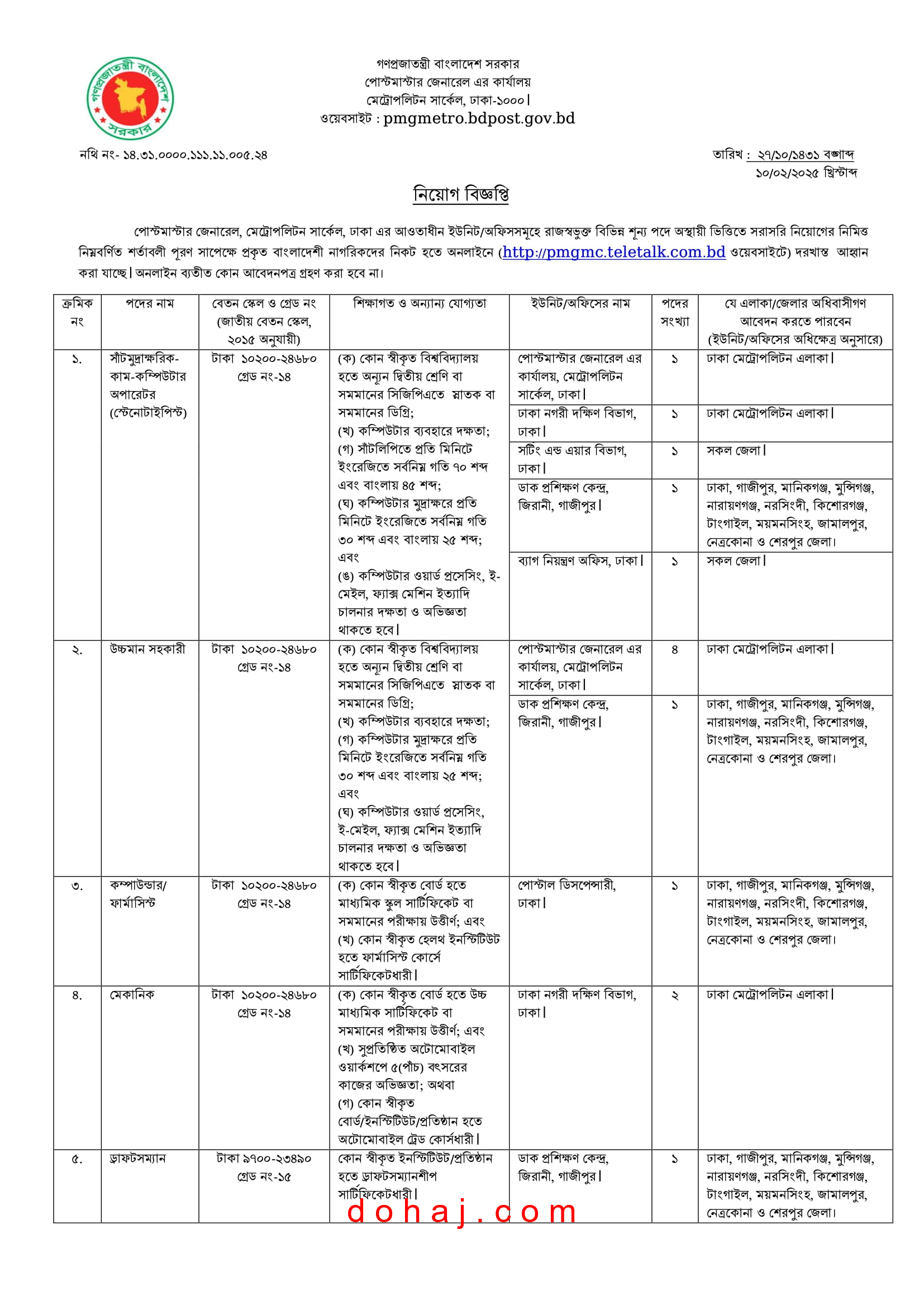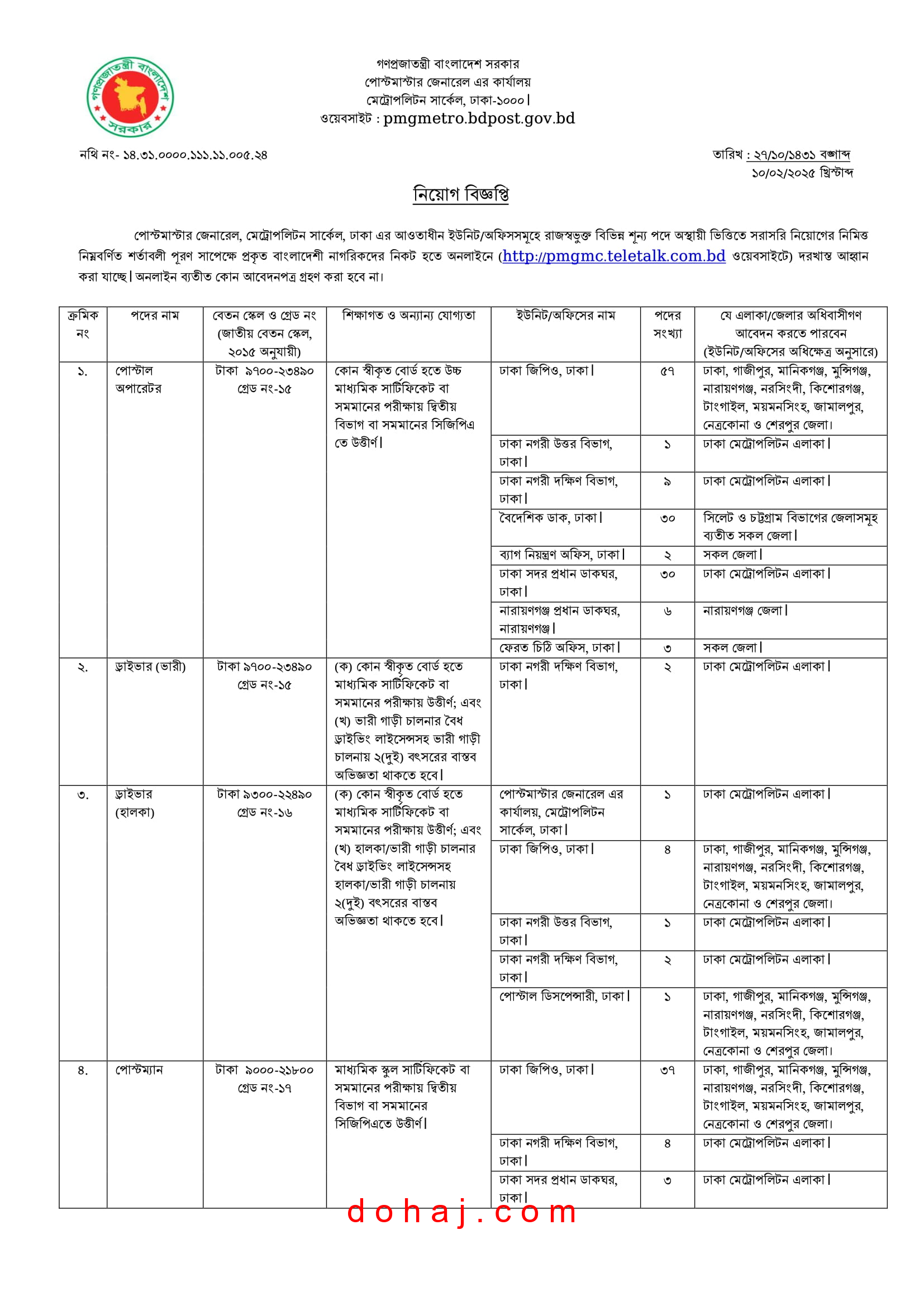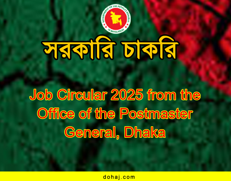 PMGMC Job Circular 2025: বাংলাদেশ ডাক বিভাগের পোস্টমাস্টার জেনারেল কার্যালয়, ঢাকা শূন্য পদসমূহে জনবল নিয়োগ দেবে। বাংলাদেশ ডাক বিভাগ পোস্টমাস্টার জেনারেল এর কার্যালয় মেট্রোপলিটন সার্কেল, ঢাকা ২২ টি পদে মোট ৩৭৮ জনকে নিয়োগ দেবে। আগ্রহী প্রার্থীরা অনলাইনে আবেদন করতে পারবেন। পদগুলোতে নারী ও পুরুষ উভয়েই আবেদন করার সুযোগ আছে। সম্পূর্ণ বিজ্ঞপ্তি বিস্তারিত দেওয়া হল।