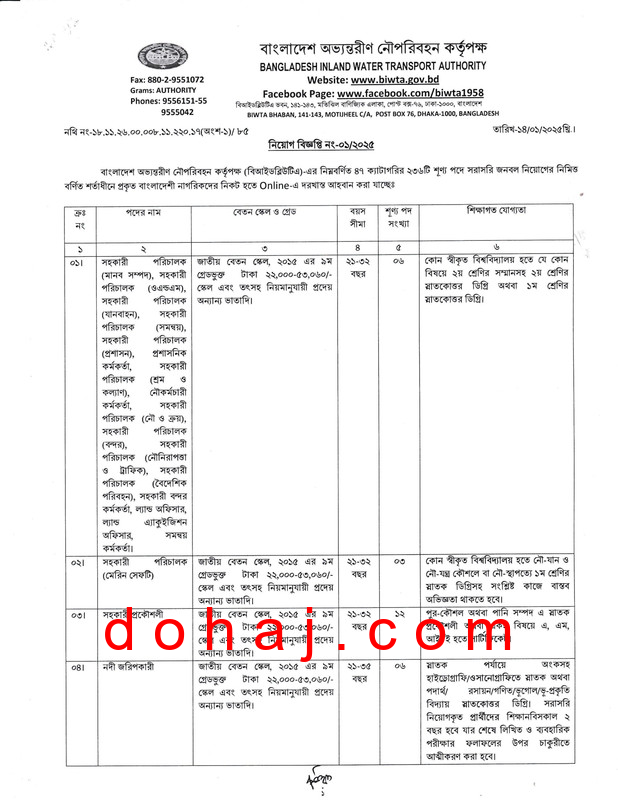 BIWTA Job Circular 2025: বাংলাদেশ অভ্যন্তরীণ নৌ-পরিবহন কর্তৃপক্ষ জনবল নিয়োগের বিজ্ঞপ্তি প্রকাশ করেছে। বাংলাদেশ অভ্যন্তরীণ নৌ-পরিবহন কর্তৃপক্ষ ৪৭ টি পদে মোট ২৩৬ জনকে নিয়োগ দেবে। উক্ত পদ গুলোতে নারী-পুরুষ উভয়ই আবেদন করতে পারবেন। আগ্রহী প্রার্থীরা অনলাইনে আবেদন করতে পারবেন। সম্পূর্ণ বিজ্ঞপ্তি বিস্তারিত দেওয়া হল।