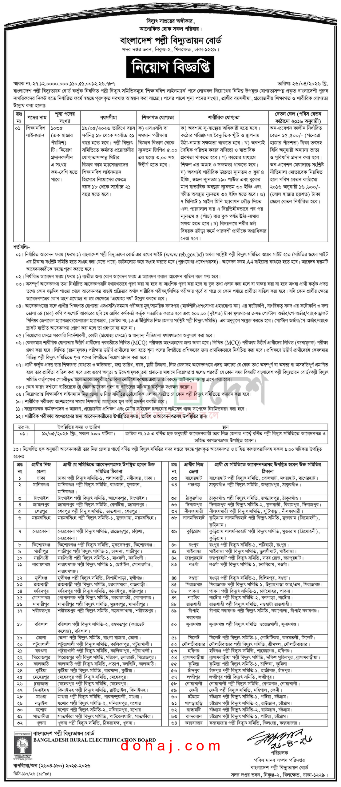 শারীরিক পরীক্ষায় অংশগ্রহণের জন্য আবেদনকারীদের উপস্থিতির সময়, তারিখ ও আবেদনপত্রসহ উপস্থিতির স্থানঃ ১৯ মে ২০২৬ তারিখ সকাল ০৯:০০ ঘটিকায় আবেদনকারী তার নিজ জেলার (নিয়োগ বিজ্ঞপ্তিতে পার্শ্বে বর্ণিত) পল্লী বিদ্যুৎ সমিতির সদর দপ্তরে স্বহস্তে পূরণকৃত আবেদনপত্র ও চাহিত কাগজপত্রাদিসহ উপস্থিত থাকতে হবে।