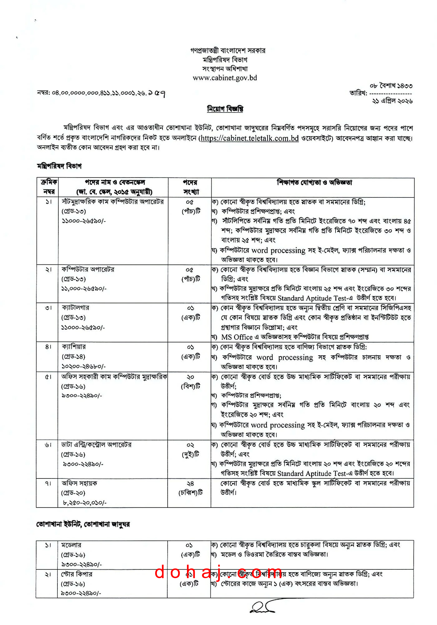 আবেদনের নিয়ম: আগ্রহী প্রার্থীরা অনলাইনে http://cabinet.teletalk.com.bd ওয়েবসাইটের মাধ্যমে আবেন করতে পারবেন।