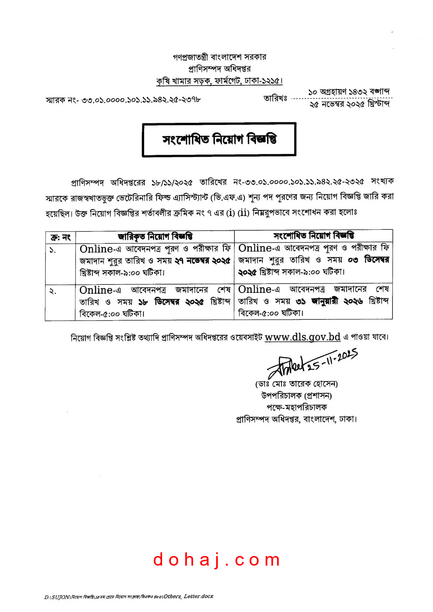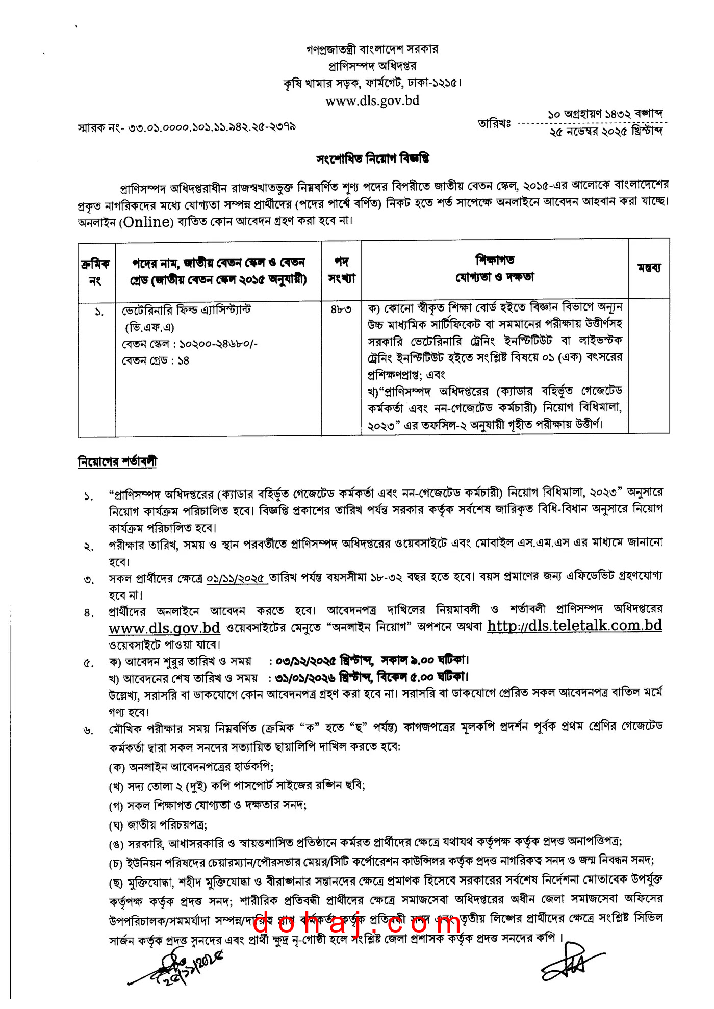 DLS Job Circular 2026: মৎস ও প্রাণিসম্পদ মন্ত্রণালয়ের আওতাধীন প্রাণিসম্পদ অধিদপ্তর কর্তৃক বাস্তবায়নাধীন প্রকল্পে এবং রাজস্বখাতের শূন্য পদসমূহে জনবল নিয়োগের বিজ্ঞপ্তি প্রকাশ করেছে। প্রাণিসম্পদ অধিদপ্তর ০১ টি পদে মোট ৪৮৩ জনকে নিয়োগ দেবে। আগ্রহী প্রার্থীরা অনলাইনে আবেদন করতে পারবেন। নারী-পুরুষ উভয়ই আবেদন করতে পারবেন। আগ্রহ ও যোগ্যতা থাকলে আপনিও আবেদন করতে পারেন। সম্পূর্ণ বিজ্ঞপ্তি বিস্তারিত দেওয়া হল।