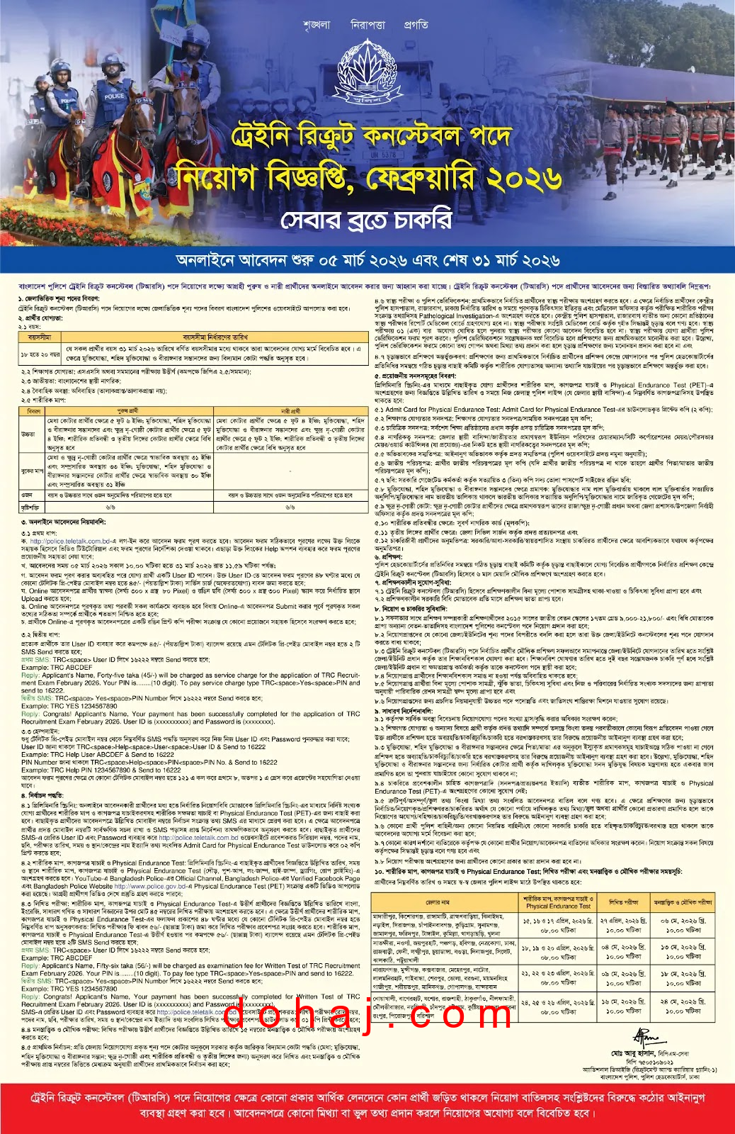 বাংলাদেশ পুলিশ বাহিনীতে কনস্টেবল পদে চাকরির নতুন নিয়োগ শুরু হয়েছে। বাংলাদেশ পুলিশ বাহিনীতে নতুন শূন্য পদে কনস্টেবল নিয়োগের বিশাল নিয়োগ বিজ্ঞপ্তি প্রকাশ করেছে। ট্রেইনি রিক্রুট কনস্টেবল (টিআরসি) অসংখ্য পদে পুরুষ ও নারী উভয় প্রার্থীদের নিয়োগ দেওয়া হবে। আগ্রহী প্রার্থীরা ০৫ মার্চ ২০২৬ তারিখ থেকে অনলাইনে আবেদন করতে পারবেন। প্রত্যেক জেলায় আলাদা আলাদা তারিখে নিয়োগ পরীক্ষা শুরু হবে, নিচে টেবিলে জেলাভিত্তিক পরীক্ষার সময়সূচি দেয়া আছে।