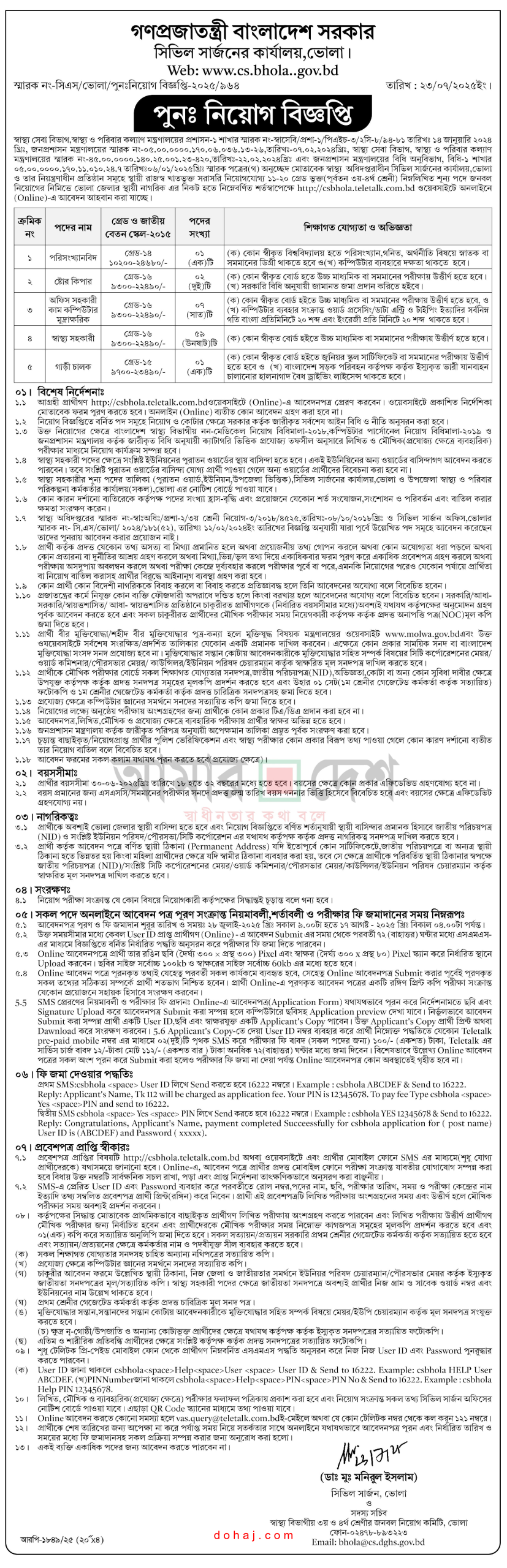 CS Bhola Job Circular 2025: সিভিল সার্জন এর কার্যালয়, ভোলা এর শূন্য পদসমূহে জনবল নিয়োগের বিজ্ঞপ্তি প্রকাশ হয়েছে। ভোলা সিভিল সার্জন এর কার্যালয়ে ০৫ টি পদে মোট ৭০ জনকে নিয়োগ দেয়া হবে। উক্ত পদ গুলোতে নারী-পুরুষ উভয়ই আবেদন করতে পারবেন। আগ্রহ ও যোগ্যতা থাকলে আপনিও আবেদন করতে পারেন। আগ্রহী প্রার্থীরা অনলাইনে আবেদন করতে পারবেন। সম্পূর্ণ বিজ্ঞপ্তি বিস্তারিত দেওয়া হল।