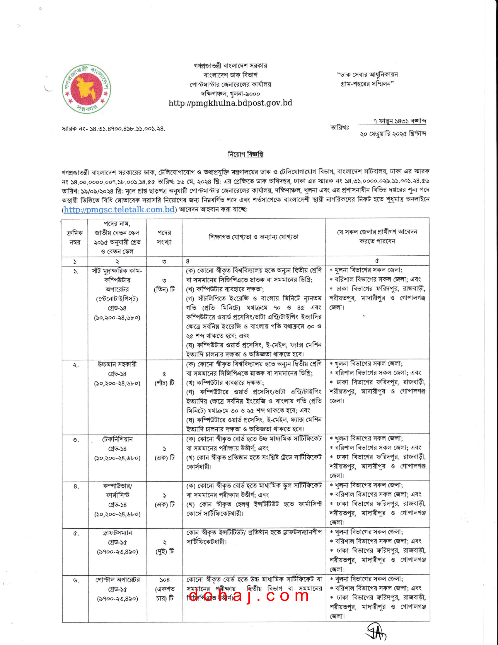 PMGSC Job Circular 2025: বাংলাদেশ ডাক বিভাগের পোস্টমাস্টার জেনারেল কার্যালয়, দক্ষিণাঞ্চল খুলনা শূন্য পদসমূহে জনবল নিয়োগ দেবে। বাংলাদেশ ডাক বিভাগ পোস্টমাস্টার জেনারেল এর কার্যালয়, দক্ষিণাঞ্চল খুলনা ২৫ টি পদে মোট ৫০৫ জনকে নিয়োগ দেবে। আগ্রহী প্রার্থীরা অনলাইনে আবেদন করতে পারবেন। পদগুলোতে নারী ও পুরুষ উভয়েই আবেদন করার সুযোগ আছে। সম্পূর্ণ বিজ্ঞপ্তি বিস্তারিত দেওয়া হল।