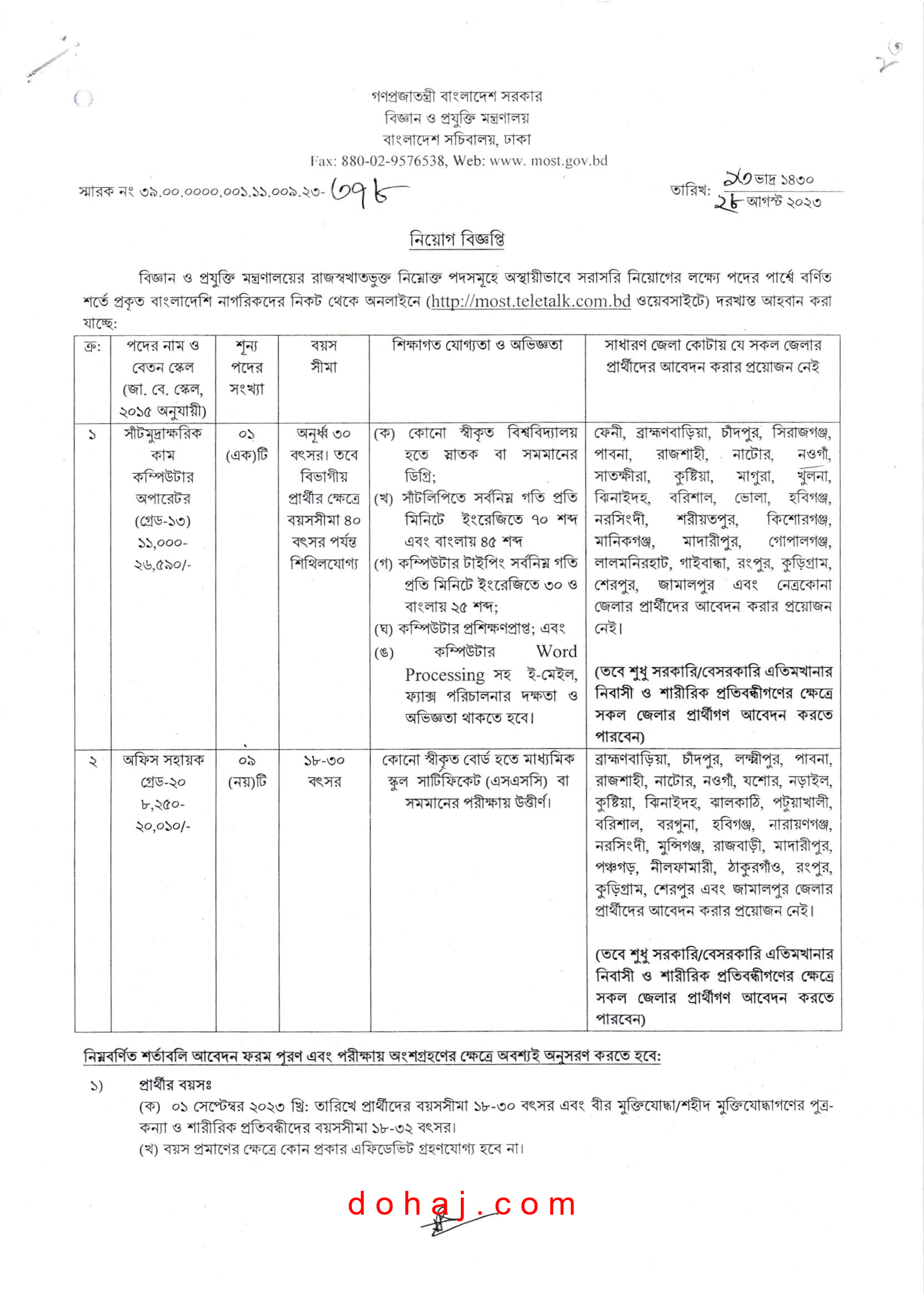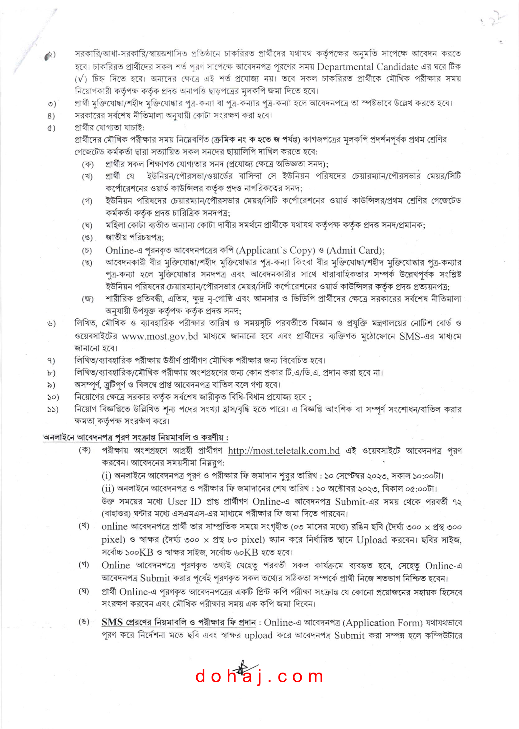 আবেদনের নিয়ম: আগ্রহী প্রার্থীরা অনলাইনে http://most.teletalk.com.bd ওয়েবসাইটের মাধ্যমে আবেন করতে পারবেন।