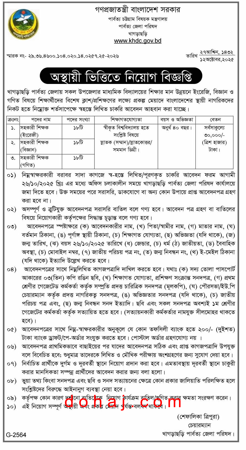 KHDC Jobs Circular 2025: খাগড়াছড়ি পার্বত্য জেলা পরিষদ শূন্য পদসমূহে জনবল নিয়োগ দিবে। খাগড়াছড়ি পার্বত্য জেলা পরিষদ ০৩ টি পদে মোট ৫৪ জনকে নিয়োগ দেবে। এই চাকরিতে খাগড়াছড়ি পার্বত্য জেলার স্থায়ী বাসিন্দারা শুধু আবেদন করতে পারবেন। পদগুলোতে নারী ও পুরুষ উভয়ই প্রার্থীরা আবেদন করতে পারবেন। সম্পূর্ণ বিজ্ঞপ্তি বিস্তারিত দেওয়া হল।