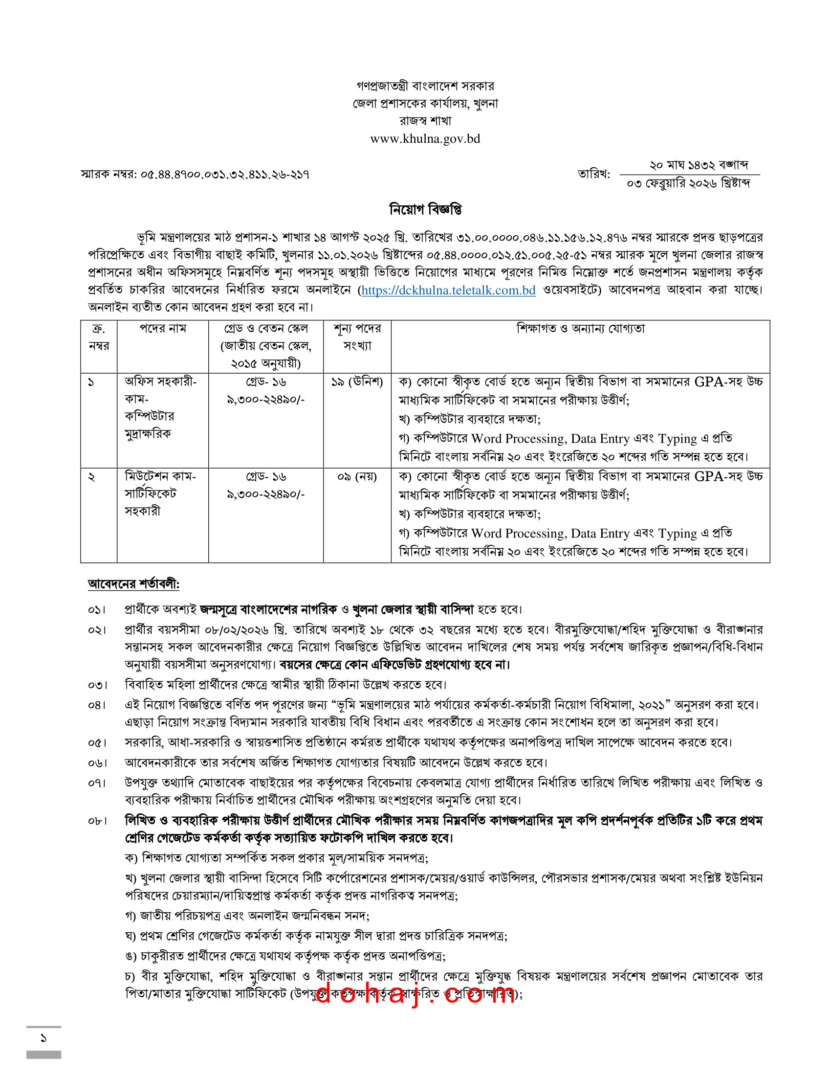 Khulna DC office Job 2026: খুলনা জেলা প্রশাসকের কার্যালয়ে শূন্য পদে লোক নিয়োগ দেয়া হবে। খুলনা জেলা প্রশাসক কার্যালয় ০২ টি পদে মোট ২৮ জনকে নিয়োগ দেবে। এই চাকরিতে খুলনা জেলার স্থায়ী বাসিন্দারা শুধু আবেদন করতে পারবেন। আগ্রহী প্রার্থীরা অনলাইনে আবেদন করতে পারবেন। পদগুলোতে নারী ও পুরুষ উভয়ই প্রার্থীরা আবেদন করতে পারবেন। সম্পূর্ণ বিজ্ঞপ্তি বিস্তারিত দেওয়া হল।