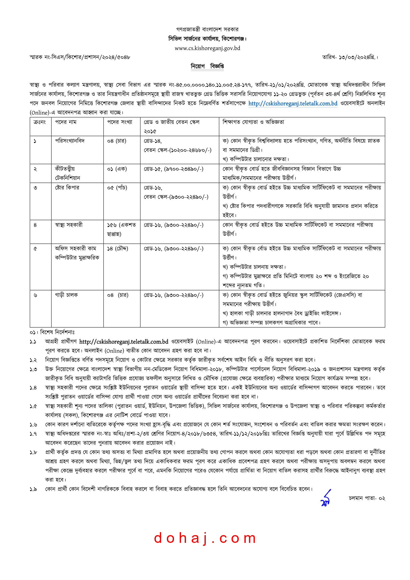 Kishoreganj Civil Surgeon Office Job Circular: সিভিল সার্জন এর কার্যালয়, কিশোরগঞ্জ এর শূন্য পদসমূহে জনবল নিয়োগের বিজ্ঞপ্তি প্রকাশ হয়েছে। কিশোরগঞ্জ সিভিল সার্জন এর কার্যালয়ে ০৭ টি পদে মোট ১৮৪ জনকে নিয়োগ দেয়া হবে। আগ্রহী প্রার্থীরা অনলাইনে আবেদন করতে পারবেন। সম্পূর্ণ বিজ্ঞপ্তি বিস্তারিত দেওয়া হল।