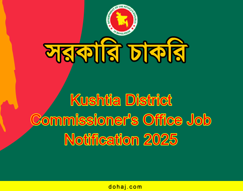 আবেদন প্রক্রিয়া: সরকার কর্তৃক চাকরির নির্ধারিত আবেদন ফরম সভাপতি, বিভাগীয় বাছাই কমিটি, খুলনা ও বিভাগীয় কমিশনার, খুলনাকে সম্বোধন করে আগামী ১৫.০৬.২০২৫ তারিখের মধ্যে অফিস চলাকালে জেলা প্রশাসক, কুষ্টিয়া এঁর কার্যালয়ে সরকারি ডাকযোগে পৌঁছাতে হবে। সরাসরি কোন আবেদনপত্র গ্রহণ করা হবে না। নির্ধারিত সময়ের পর প্রাপ্ত আবেদন গ্রহণযোগ্য নয়।