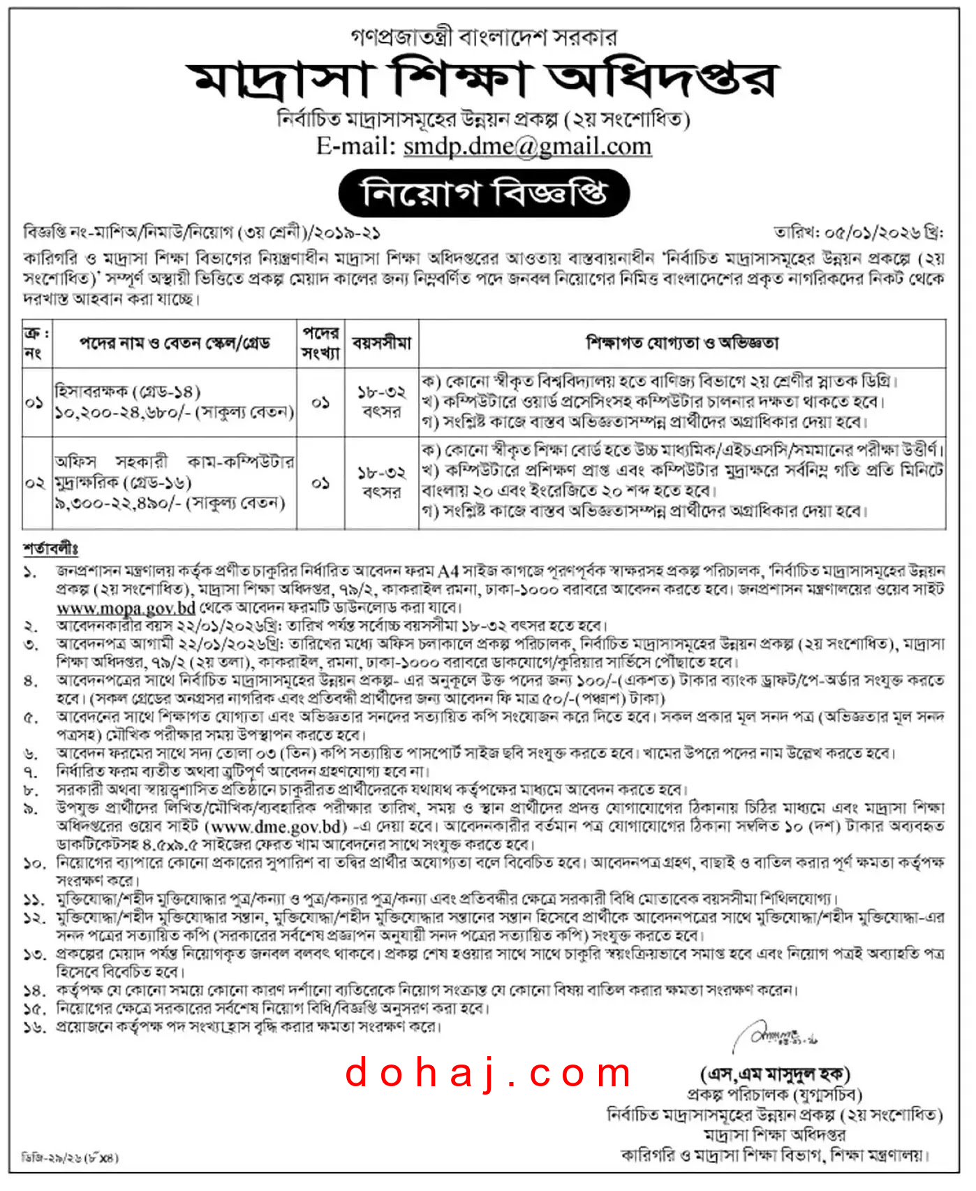 আবেদনের নিয়ম: আগ্রহী প্রার্থীদের আবেদনপত্র আগামী ২২/০১/২০২৬খ্রিঃ তারিখের মধ্যে অফিস চলাকালে প্রকল্প পরিচালক, নির্বাচিত মাদ্রাসাসমূহের উন্নয়ন প্রকল্প (২য় সংশোধিত), মাদ্রাসা শিক্ষা অধিদপ্তর, ৭৯/২ (২য় তলা), কাকরাইল, রমনা, ঢাকা-১০০০ বরাবরে ডাকযোগে/কুরিয়ার সার্ভিসে পৌঁছাতে হবে।।