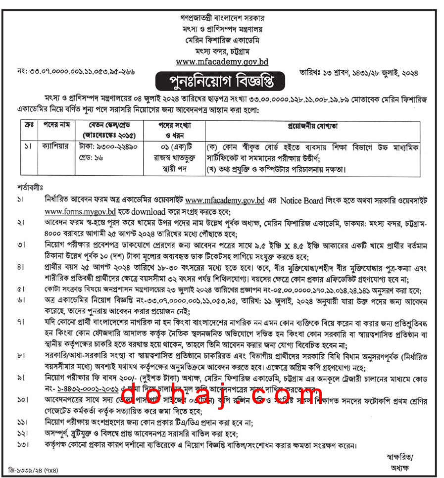 বাংলাদেশ মেরিন ফিশারিজ একাডেমির অধীনে শূন্য পদে সরাসরি লোক নিয়োগ দেয়া হবে। মেরিন ফিশারিজ একাডেমি ১ টি পদে নিয়োগ দেবে। আগ্রহ ও যোগ্যতা থাকলে আপনিও আবেদন করতে পারেন। সম্পূর্ণ বিজ্ঞপ্তি বিস্তারিত দেওয়া হল।