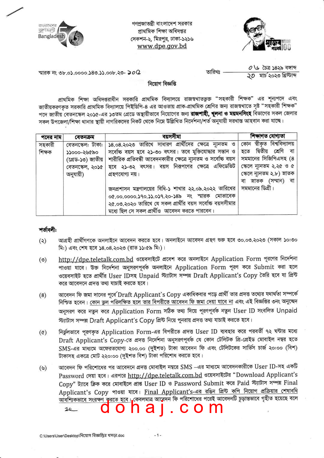 বেতন স্কেল: ১১,০০০-২৬,৫৯০ টাকা।