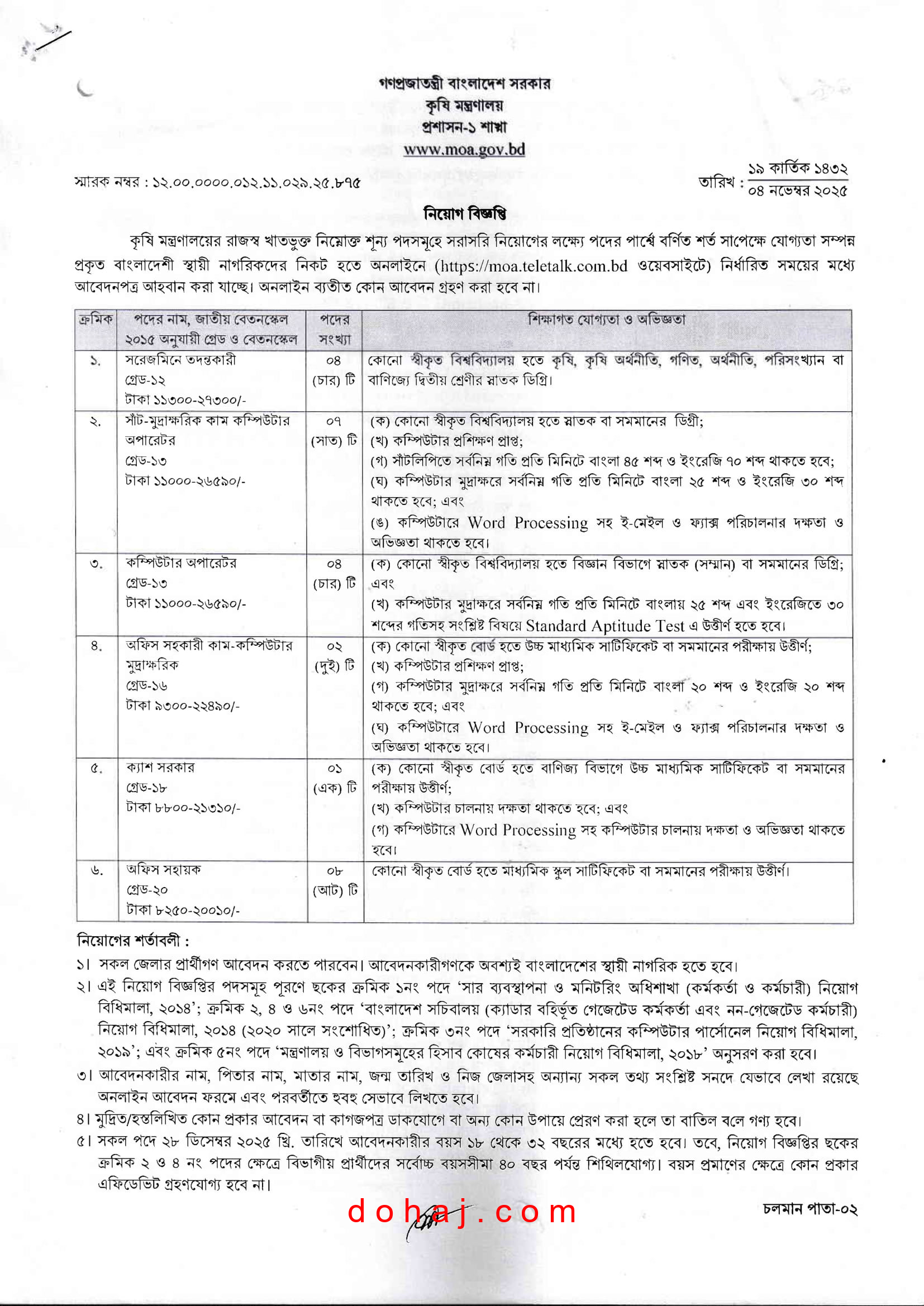 MOA Job Circular 2025: কৃষি মন্ত্রণালয়ের শূন্য পদসমূহে জনবল নিয়োগের বিজ্ঞপ্তি প্রকাশ হয়েছে। কৃষি মন্ত্রণালয় ০৬ টি পদে মোট ২৬ জনকে নিয়োগ দেবে। পদগুলোতে নারী ও পুরুষ উভয়েই আবেদন করতে পারবেন। আগ্রহী প্রার্থীরা অনলাইনে আবেদন করতে পারবেন। আগ্রহ ও যোগ্যতা থাকলে আপনিও আবেদন করতে পারেন। সম্পূর্ণ বিজ্ঞপ্তি বিস্তারিত দেওয়া হল।
