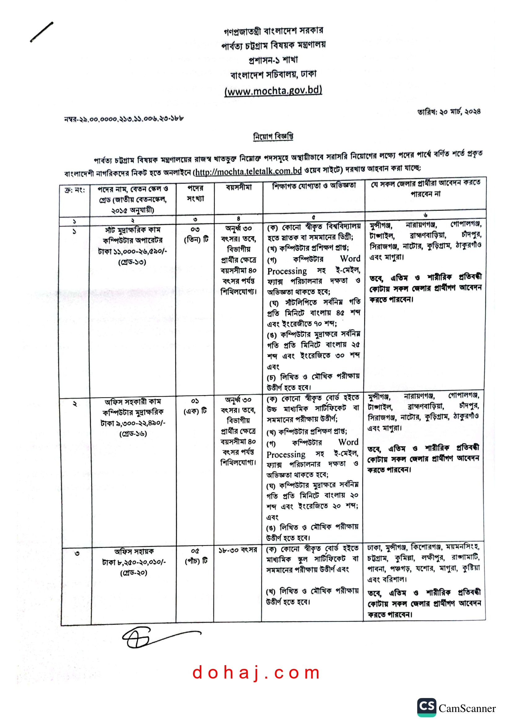 Mochta Job circular 2024: পার্বত্য চট্টগ্রাম বিষয়ক মন্ত্রণালয়ের শূন্য পদসমূহে জনবল নিয়োগ দেয়া হবে। পার্বত্য চট্টগ্রাম বিষয়ক মন্ত্রণালয় ০৩ টি পদে মোট ০৯ জনকে নিয়োগ দেবে। পদগুলোতে নারী ও পুরুষ উভয়েই আবেদন করতে পারবেন। আগ্রহী প্রার্থীরা অনলাইনে আবেদন করতে পারবেন। আগ্রহ ও যোগ্যতা থাকলে আপনিও আবেদন করতে পারেন। সম্পূর্ণ বিজ্ঞপ্তি বিস্তারিত দেওয়া হল।