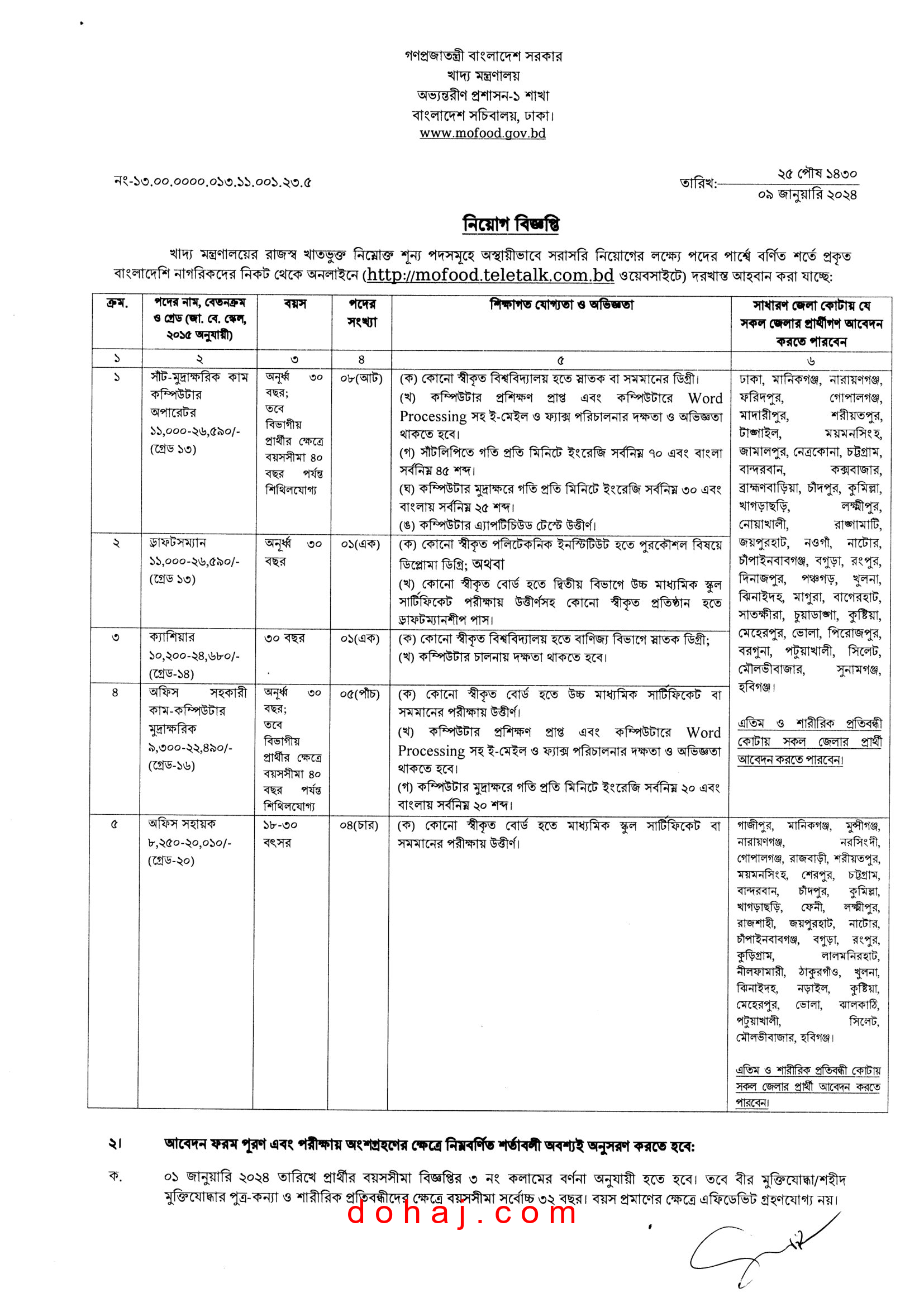 অন্যান্য যোগ্যতা: ওয়ার্ড প্রসেসিং, ডাটা এন্ট্রি এবং টাইপিং-এ প্রতি মিনিটে শব্দের গতি বাংলা ও ইংরেজিতে ২০।