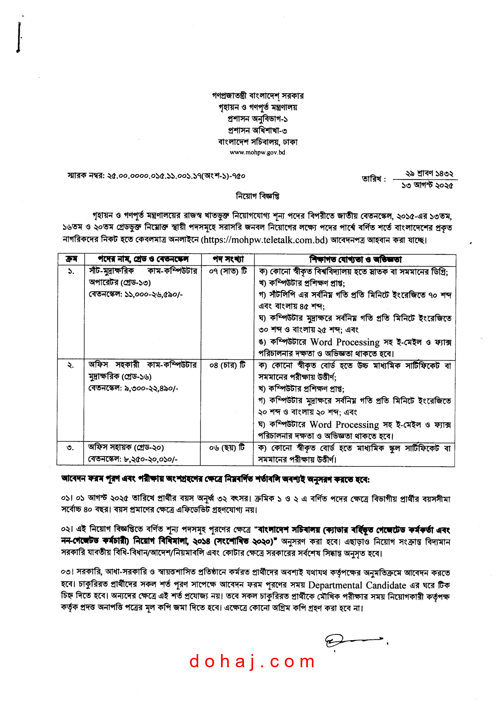 Ministry of Housing and Public Works Job Circular 2025: গৃহায়ন ও গণপূর্ত মন্ত্রণালয়ের শূন্য পদসমূহে জনবল নিয়োগর বিজ্ঞপ্তি প্রকাশ হয়েছে। গৃহায়ন ও গণপূর্ত মন্ত্রণালয় ০৩ টি পদে মোট ১৭ জনকে নিয়োগ দেয়া হবে। পদগুলোতে নারী ও পুরুষ উভয়েই আবেদন করতে পারবেন। আগ্রহী প্রার্থীরা অনলাইনে আবেদন করতে পারবেন। আগ্রহ ও যোগ্যতা থাকলে আপনিও আবেদন করতে পারেন। সম্পূর্ণ বিজ্ঞপ্তি বিস্তারিত দেওয়া হল।