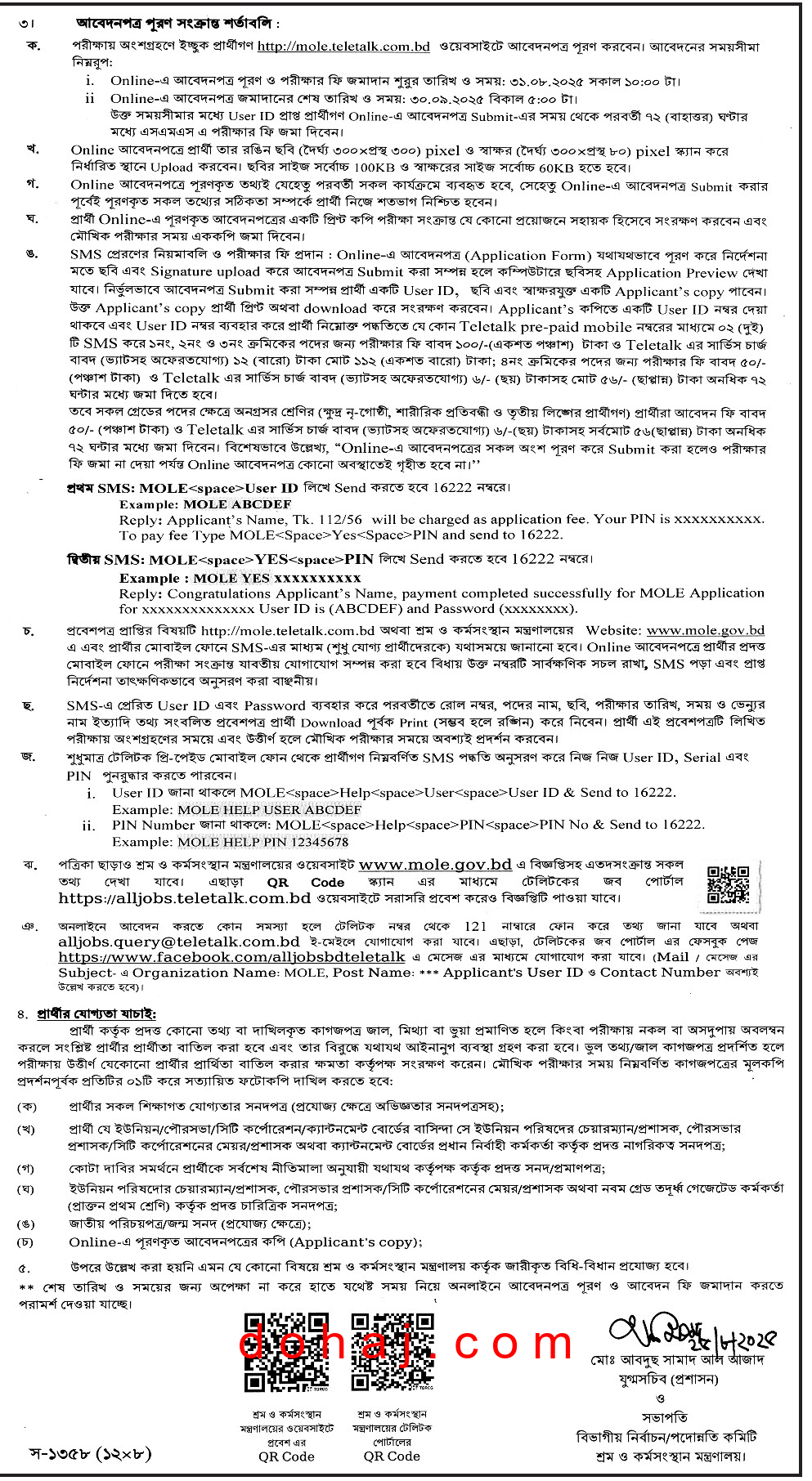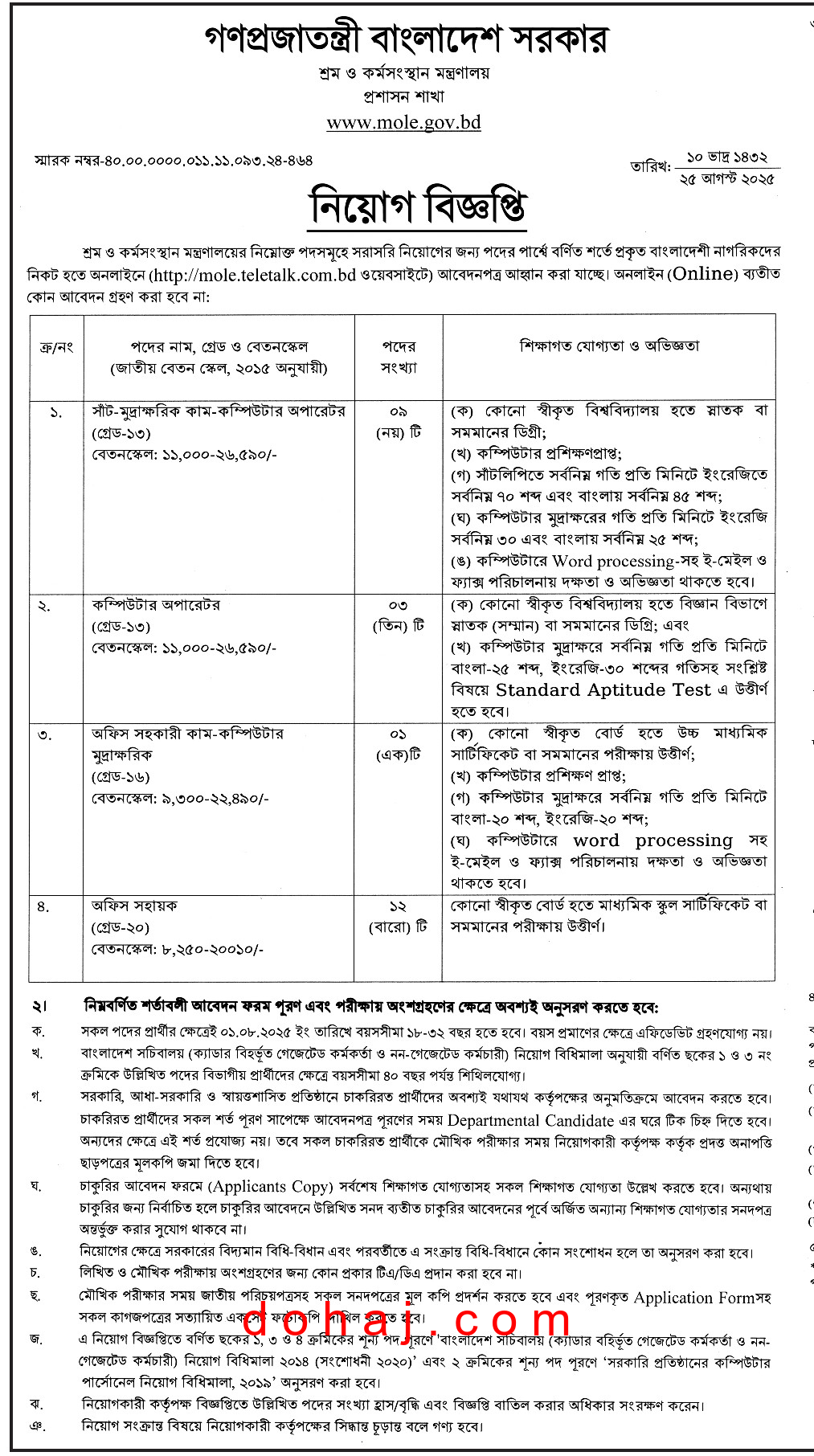 আবেদন প্রক্রিয়া: আবেদন করতে হবে অনলাইনে http://mole.teletalk.com.bd ওয়েবসাইটের মাধমে অনলাইনে আবেদনপত্র পাঠাতে হবে।