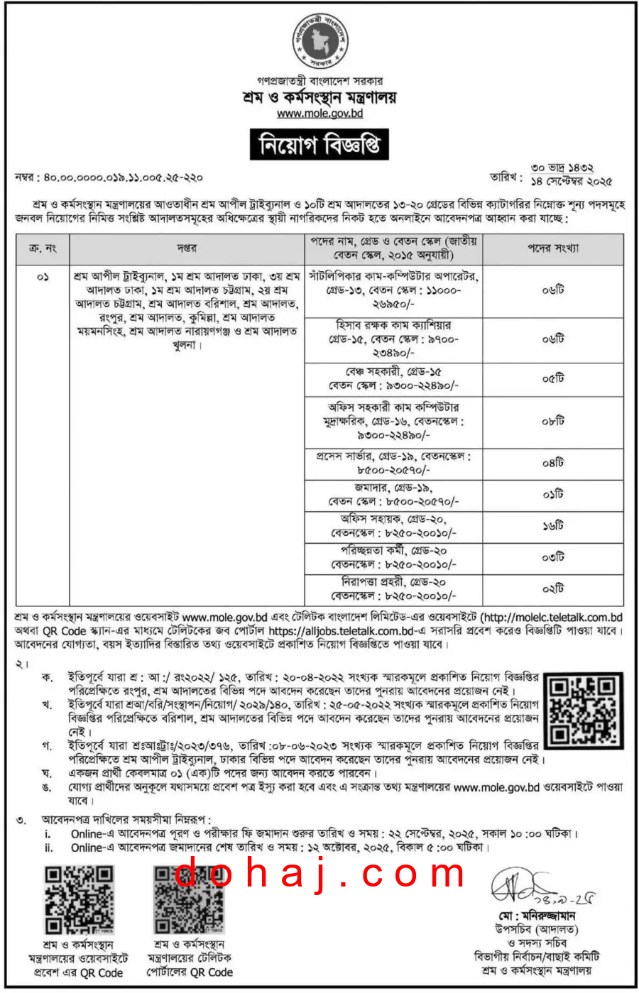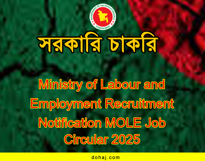 MOLE Job Circular 2025: শ্রম ও কর্মসংস্থান মন্ত্রণালয় শূন্য পদসমূহে জনবল নিয়োগের নতুন ০২ টি নিয়োগ বিজ্ঞপ্তি প্রকাশ হয়েছে। শ্রম ও কর্মসংস্থান মন্ত্রণালয় ১ম বিজ্ঞপ্তি অনুসারে ০৯ টি পদে মোট ৫১ জন এবং ২য় বিজ্ঞপ্তি অনুসারে ০৪ টি পদে মোট ২৫ জনকে নিয়োগ দেবে। নারী ও পুরুষ উভয়কেই নিয়োগ দেওয়া হবে। আগ্রহী প্রার্থীরা অনলাইনে আবেদন করতে পারবেন। আগ্রহ ও যোগ্যতা থাকলে আপনিও আবেদন করতে পারেন। সম্পূর্ণ বিজ্ঞপ্তি বিস্তারিত দেওয়া হল।