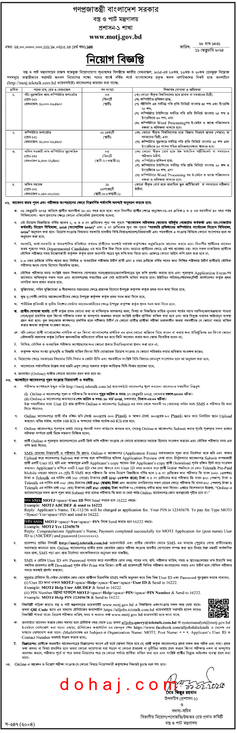 Ministry of Textiles and Jute (MOTJ) Job Circular: বস্ত্র ও পাঠ মন্ত্রণালয়ের শূন্য পদসমূহে জনবল নিয়োগ দেয়া হবে। বস্ত্র ও পাঠ মন্ত্রণালয় ০৪ টি পদে মোট ১৮ জনকে নিয়োগ দেবে। নারী ও পুরুষ উভয়কেই নিয়োগ দেওয়া হবে। আগ্রহী প্রার্থীরা অনলাইনে আবেদন করতে পারবেন। আগ্রহ ও যোগ্যতা থাকলে আপনিও আবেদন করতে পারেন। সম্পূর্ণ বিজ্ঞপ্তি বিস্তারিত দেওয়া হল।