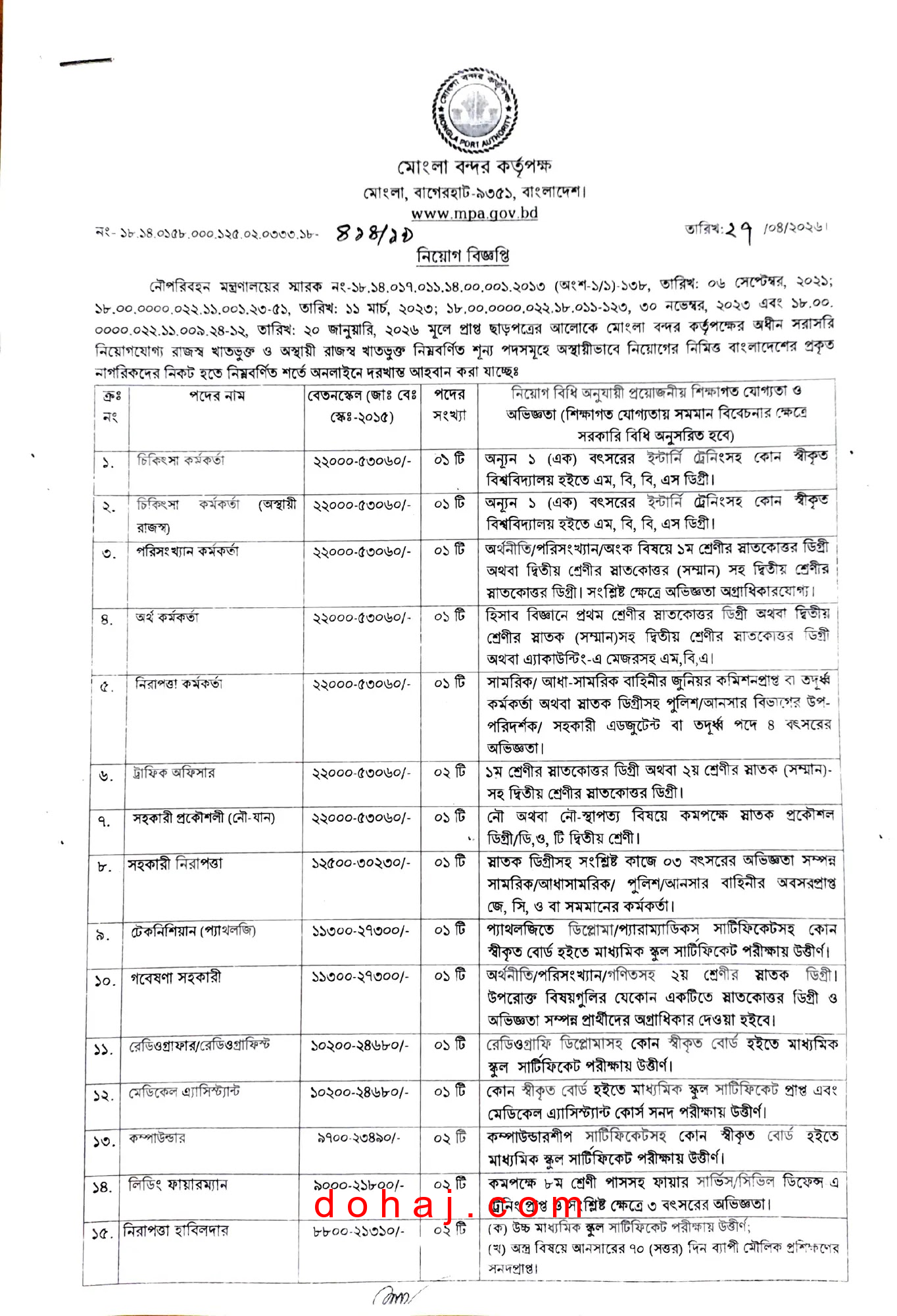 MPA Job Circular 2026: মোংলা বন্দর কর্তৃপক্ষের অধীন সরাসরি নিয়োগযোগ্য রাজস্ব খাতভুক্ত নিম্নবর্ণিত তাদের শূন্য পদসমূহের জন্য জনবল নিয়োগের বিজ্ঞপ্তি প্রকাশ করেছে। মোংলা বন্দর কর্তৃপক্ষ ১৭ টি পদে মোট ১৩৯ জনকে নিয়োগ দেওয়া হবে। পদগুলোয় নারী-পুরুষ উভয়েই আবেদন করতে পারবেন।আগ্রহী প্রার্থীরা অনলাইনে আবেদন করতে পারবেন। সম্পূর্ণ চাকরির খবর বিস্তারিত দেওয়া হল।