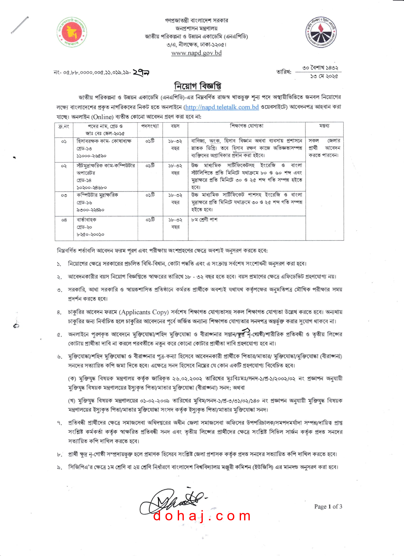 National Academy for Planning and Development (NAPD) Job Circular 2025: জাতীয় পরিকল্পনা ও উন্নয়ন একাডেমি (এনএপিডি) তাদের শূন্য পদসমূহে জনবল নিয়োগের জন্য চাকরির বিজ্ঞপ্তি প্রকাশ করেছে। এনএপিডি ০৪ টি পদে নিয়োগ দেবে। উক্ত পদ গুলোতে নারী- পুরুষ উভয়ই আবেদন করতে পারবেন। আগ্রহী প্রার্থীরা অনলাইনে আবেদন করতে পারবেন। আগ্রহ ও যোগ্যতা থাকলে আপনিও আবেদন করতে পারেন। আবেদন প্রক্রিয়াসহ সম্পূর্ণ বিজ্ঞপ্তি বিস্তারিত দেওয়া হল:
