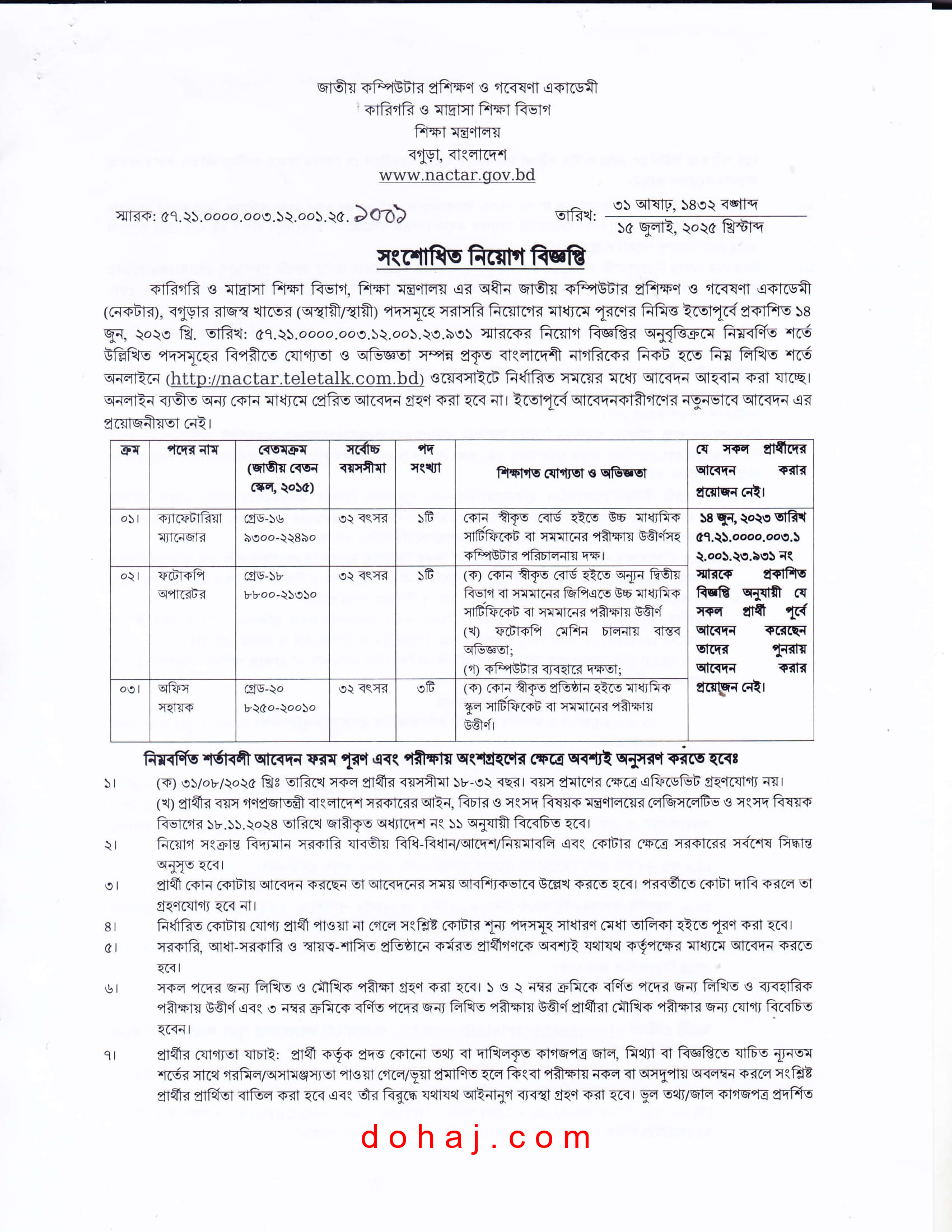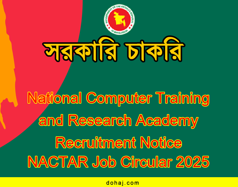 NACTAR Job Circular 2025: কারিগরি ও মাদ্রাসা শিক্ষা বিভাগ, শিক্ষা মন্ত্রণালয় এর অধীন জাতীয় কম্পিউটার প্রশিক্ষণ ও গবেষণা একাডেমী (নেকটার) শূন্য পদসমূহে জনবল নিয়োগ দেবে। জাতীয় কম্পিউটার প্রশিক্ষণ ও গবেষণা একাডেমী ০৩ টি পদে মোট ০৫ জনকে নিয়োগ দেবে। পদগুলোতে নারী ও পুরুষ উভয়েই আবেদন করতে পারবেন। আগ্রহী প্রার্থীরা অনলাইনে আবেদন করতে পারবেন। আগ্রহ ও যোগ্যতা থাকলে আপনিও আবেদন করতে পারেন। সম্পূর্ণ বিজ্ঞপ্তি বিস্তারিত দেওয়া হল।