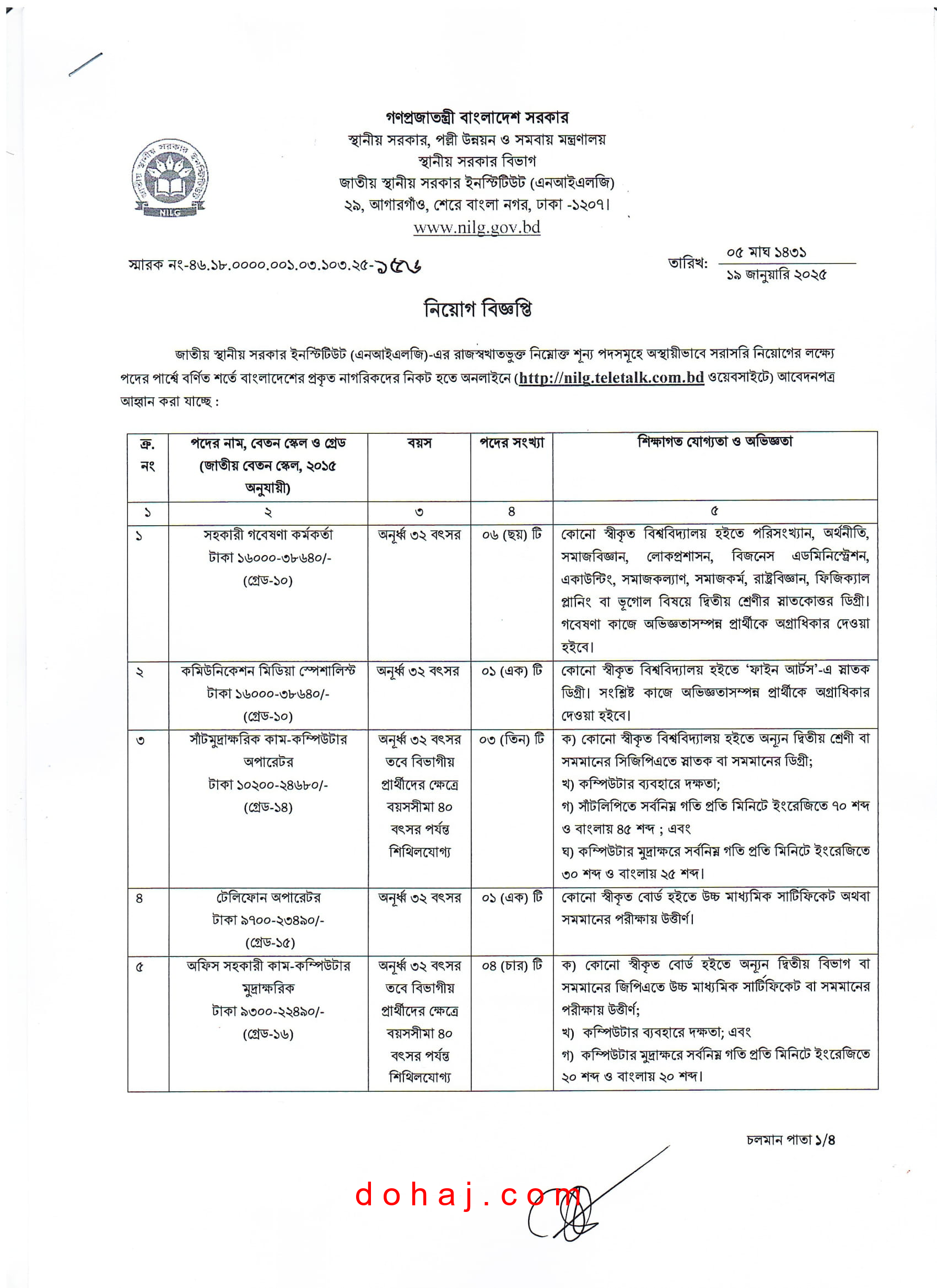 জাতীয় স্থানীয় সরকার ইনস্টিটিউট (এনআইএলজি) স্থায়ী শূন্য পদসমূহে জনবল নিয়োগের নিয়োগ বিজ্ঞপ্তি প্রকাশ করেছে। জাতীয় স্থানীয় সরকার ইনস্টিটিউট ০৯ টি পদে ২২ জনকে নিয়োগ দেবে। আগ্রহী প্রার্থীরা অনলাইনে আবেদন করতে পারবেন। পদগুলোতে নারী ও পুরুষ উভয়েই আবেদন করতে পারবেন। আগ্রহ ও যোগ্যতা থাকলে আপনিও আবেদন করতে পারেন। সম্পূর্ণ বিজ্ঞপ্তি বিস্তারিত দেওয়া হল।