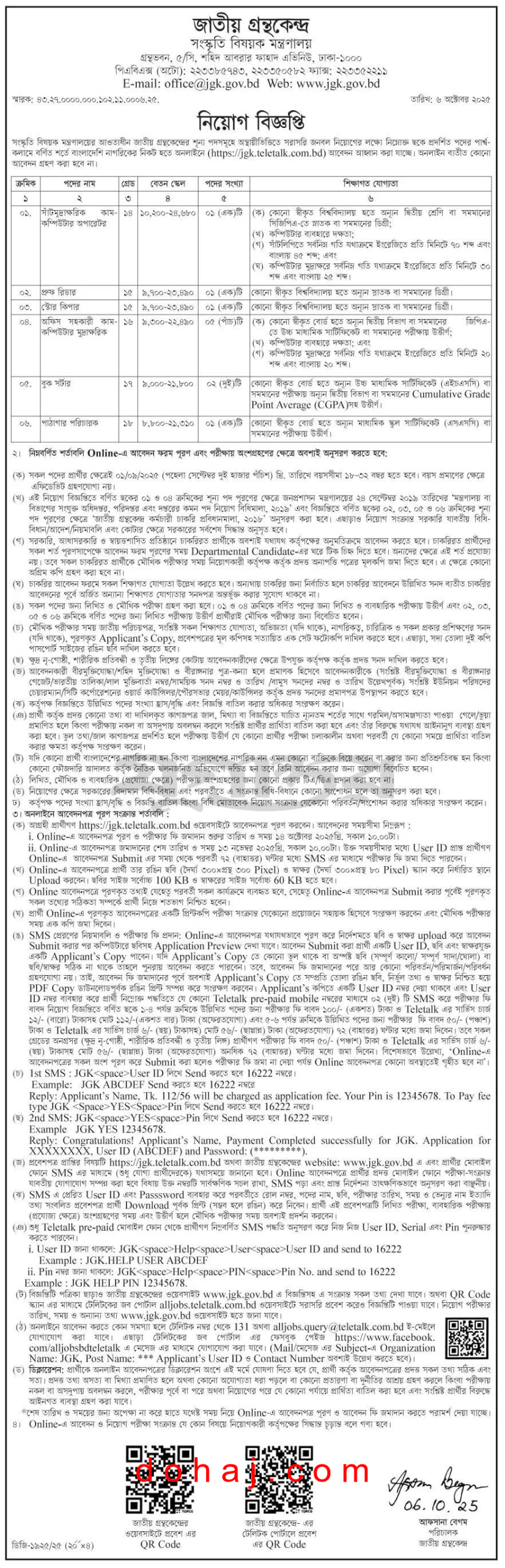 JGK Job Circular 2025: সংস্কৃতি বিষয়ক মন্ত্রণালয়ের আওতাধীন জাতীয় গ্রন্থকেন্দ্র তাদের শূন্য পদসমূহে জনবল নিয়োগ দেবে। জাতীয় গ্রন্থকেন্দ্র ০৬ টি পদে ১১ জনকে এই নিয়োগ দেবে। উক্ত পদে নারী- পুরুষ উভয়ই আবেদন করতে পারবেন। আগ্রহী প্রার্থীরা অনলাইনে আবেদন করতে পারবেন। আগ্রহ ও যোগ্যতা থাকলে আপনিও আবেদন করতে পারেন। আবেদন প্রক্রিয়াসহ সম্পূর্ণ বিজ্ঞপ্তি বিস্তারিত দেওয়া হল: