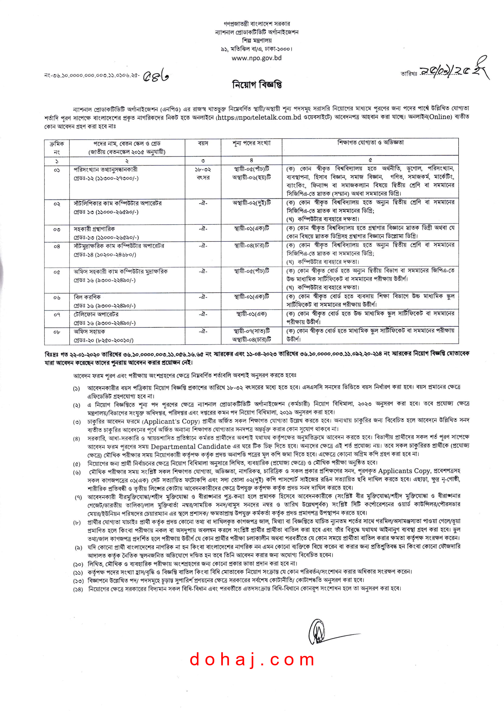 NPO Job Circular 2025: গণপ্রজাতন্ত্রী বাংলাদেশ সরকারের ন্যাশনাল প্রোডাকটিভিটি অর্গানাইজেশন (এনপিও) এর স্থায়ী শূন্য পদ গুলোতে জনবল নিয়োগ দেয়া হবে। প্রতিষ্ঠানটি ০৮ টি পদে মোট ৩৬ জনকে নিয়োগ দেবে। পদগুলোতে নারী ও পুরুষ উভয়েই আবেদন করতে পারবেন। আগ্রহী প্রার্থীরা অনলাইনে আবেদন করতে পারবেন। আগ্রহ ও যোগ্যতা থাকলে আপনিও আবেদন করতে পারেন। সম্পূর্ণ বিজ্ঞপ্তি বিস্তারিত দেওয়া হল।