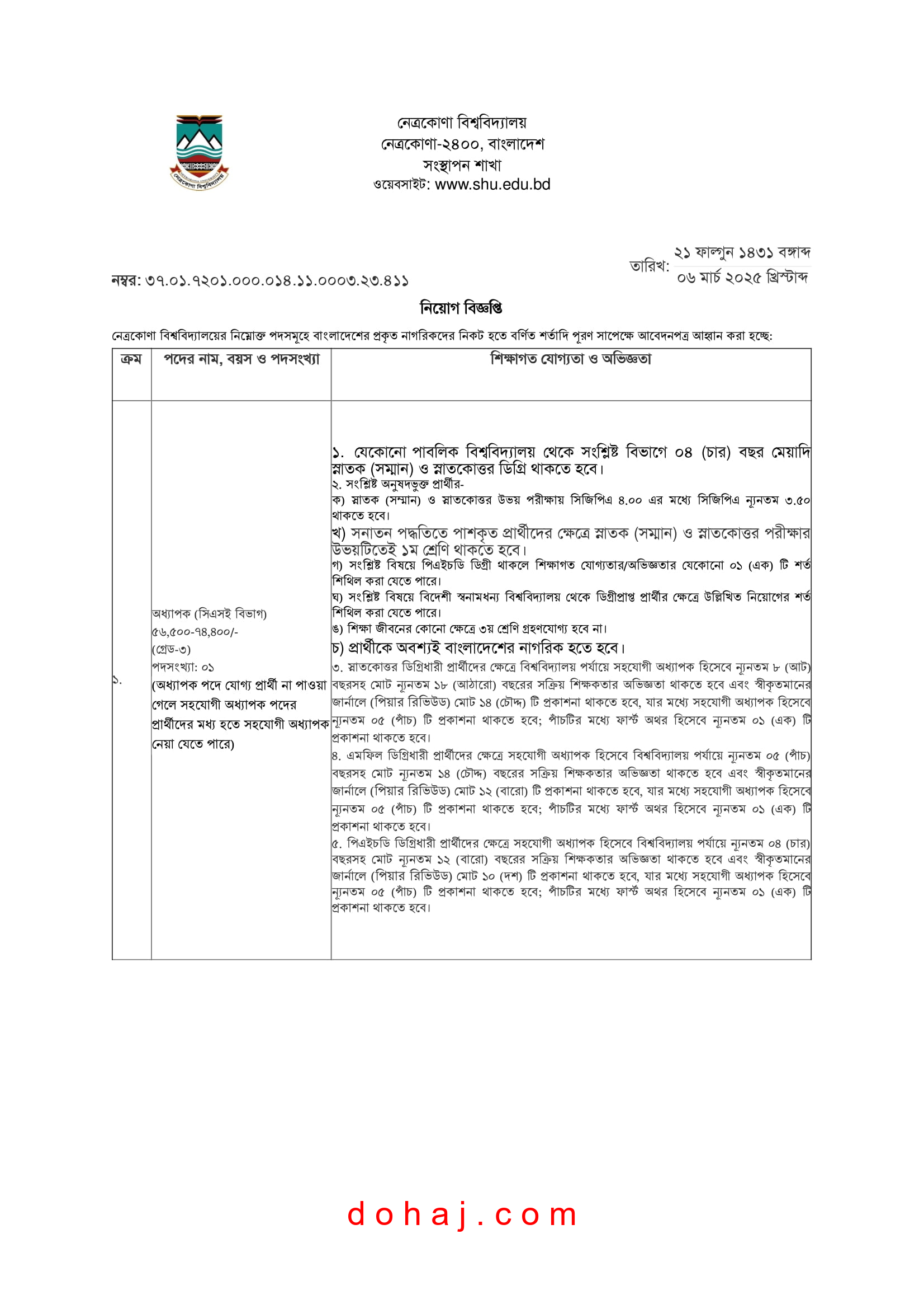 পদের নাম: অধ্যাপক (সিএসসি বিভাগ)