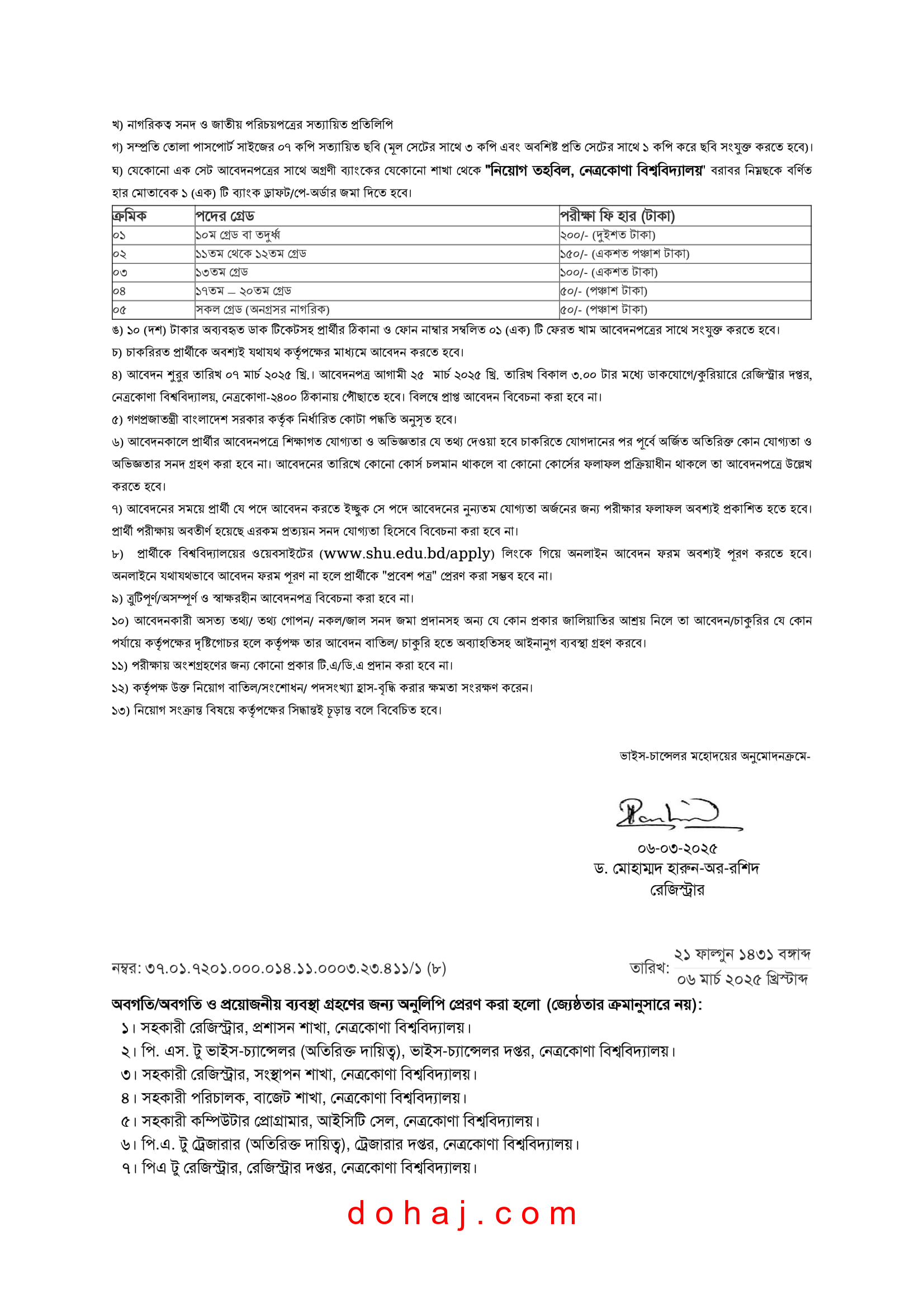 আবেদনের নিয়ম: আগ্রহী প্রার্থীরা বিশ্ববিদ্যালয় কর্তৃক নির্ধারিত আবেদন ফরম পূরণ করে আগামী ২৫ মার্চ ২০২৫ খ্রি. তারিখ বিকাল ৩.০০ টার মধ্যে অফিস চলাকালীন সময়ে রেজিস্ট্রার দপ্তর, নেত্রকোনা বিশ্ববিদ্যালয় নেত্রকোনা- ২৪০০ ঠিকানায় ডাকযোগে/কুরিয়ারে মাধ্যমে পৌঁছাতে হবে।